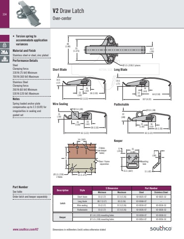 334ACTUAL SIZE48(1.88) 35(1.375)12.7(.50)Ø 5.5 (.218) 2 placesDimensions in millimeters (inch) unless otherwise stated• Torsion spring to accommodate application variancesMaterial and FinishStainless steel or steel, zinc platedPerformance DetailsSteelClamping force:330 N (75 lbf) Minimum700 N (160 lbf) MaximumStainless SteelClamping force:260 N (60 lbf) Minimum530 N (120 lbf) MaximumNotesSpring loaded anchor plate compensates up to 2.3 (0.09) for irregularities in sealing and gasket setV2 Draw LatchOver-center www.southco.com/V2Part NumberSee tableOrder latch and keeper separatelyShort BladeLong BladeLong BladeWire SealingPadlockable14.5(.57)38 (1.50) 82 (3.22) 82 (3.22) 82 (3.22) 107 (4.22) 13(.50)16(.63)64 (2.50) 19.5(.77)13(.50)16(.63)15(.59)38 (1.50) 25(1.00)16(.63)22(.88)38 (1.50) 25(1.00)16(.63)Ø 9.5 (.38)Ø 2.4 (.09)24(.95) 17(.65)13(.50)16(.63)79 (3.12) Short BladeLong BladeLong BladeWire SealingPadlockable14.5(.57)38 (1.50) 82 (3.22) 82 (3.22) 82 (3.22) 107 (4.22) 13(.50)16(.63)64 (2.50) 19.5(.77)13(.50)16(.63)15(.59)38 (1.50) 25(1.00)16(.63)22(.88)38 (1.50) 25(1.00)16(.63)Ø 9.5 (.38)Ø 2.4 (.09)24(.95) 17(.65)13(.50)16(.63)79 (3.12) Short BladeLong BladeLong BladeWire SealingPadlockable14.5(.57)38 (1.50) 82 (3.22) 82 (3.22) 82 (3.22) 107 (4.22) 13(.50)16(.63)64 (2.50) 19.5(.77)13(.50)16(.63)15(.59)38 (1.50) 25(1.00)16(.63)22(.88)38 (1.50) 25(1.00)16(.63)Ø 9.5 (.38)Ø 2.4 (.09)24(.95) 17(.65)13(.50)16(.63)79 (3.12) Short BladeLong BladeLong BladeWire SealingPadlockable14.5(.57)38 (1.50) 82 (3.22) 82 (3.22) 82 (3.22) 107 (4.22) 13(.50)16(.63)64 (2.50) 19.5(.77)13(.50)16(.63)15(.59)38 (1.50) 25(1.00)16(.63)22(.88)38 (1.50) 25(1.00)16(.63)Ø 9.5 (.38)Ø 2.4 (.09)24(.95) 17(.65)13(.50)16(.63)79 (3.12) Short Blade Long BladeWire Sealing Padlockable14 (.562)S35 (1.375) 5.5 (.218)2 HolesØ2 Holes(see keepertable)Door / frameseparation25(1.00)6(.25)15.5 (.607)2(.08)11 (.42)MountingholeDescription StyleS Dimension Part NumberMinimum Maximum Steel Stainless SteelLatchShort blade 55 (2.17) 57.3 (2.26) V2-0025-07 V2-0025-52Long blade 80.7 (3.17) 83 (3.26) V2-0068-07 ~Wire sealing 55 (2.17) 57.3 (2.26) V2-0034-07 V2-0034-52Padlockable 55 (2.17) 57.3 (2.26) V2-0026-07 V2-0026-52Keeper Ø 3.4 (.135) mounting holes V2-0018-07 V2-0018-52Ø 5.5 (.218) mounting holes V2-0054-07 V2-0054-52Keeper