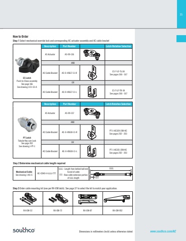 35Dimensions in millimeters (inch) unless otherwise statedMechanical CableSee drawing J-AC-C AC-C0H0-4-LLLL-TTTLLLL - Length from behind ball end to end of cableTTT - Raw cable extension portion of LLLL lengthLLLLTTTLLLLTTTR4-EM-52 R4-EM-72 R4-EM-87 R4-EM-952How to OrderStep 1 Select mechanical override lock and corresponding AC actuator assembly and AC cable bracketStep 2 Determine mechanical cable length requiredStep 3 Order cable mounting kit (one per R4-EM latch). See page 37 to select the kit to match your application.Description Part Number Latch Rotation SelectionE5 Latch Push-to-Close assemblySee page 166See drawing J-E5-53-AA5 Actuator A5-99-136ANDAC Cable Bracket AC-0-49617-11-R E5-T-LF-TL-1KSee pages 166 - 167ORAC Cable Bracket AC-0-49617-11-L E5-T-LF-TR-1KSee pages 166 - 167LLLLTTTLLLLTTTLLLLTTTLLLLTTTDescription Part Number Latch Rotation SelectionPT LatchTubular Key cam LockSee page 202See drawing J-PT-1A5 Actuator A5-99-157ANDAC Cable Bracket AC-0-49618-11-R PT-1-HC109-20K-KCSee pages 202 - 203ORAC Cable Bracket AC-0-49618-11-L PT-1-HC101-20K-KCSee pages 202 - 203LLLLTTTLLLLTTTLLLLTTTwww.southco.com/AC