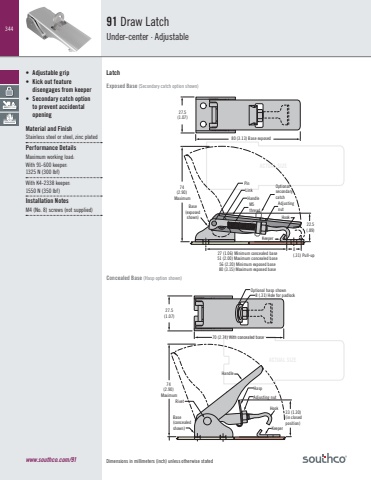 344ACTUAL SIZEACTUAL SIZEDimensions in millimeters (inch) unless otherwise stated• Adjustable grip • Kick out feature disengages from keeper• Secondary catch option to prevent accidental openingMaterial and FinishStainless steel or steel, zinc platedPerformance Details Maximum working load:With 91-600 keeper: 1325 N (300 lbf)With K4-2338 keeper: 1550 N (350 lbf)Installation NotesM4 (No. 8) screws (not supplied)91 Draw LatchUnder-center · Adjustable74 (2.90) Maximum27 (1.06) Minimum concealed base51 (2.00) Maximum concealed base56 (2.20) Minimum exposed base80 (3.15) Maximum exposed base8 (.31) Pull-upBase(exposedshown)LinkHandleOptional secondary catch M5threadAdjusting nutPinHookKeeper80 (3.13) Base exposed27.5(1.07)22.5(.89)74 (2.90) Maximum33 (1.30)(in closedposition)27.5(1.07)HaspBase(concealedshown)RivetHandleKeeper70 (2.74) With concealed base Adjusting nut8 (.31) Hole for padlockHookOptional hasp shownLatchExposed Base (Secondary catch option shown)Concealed Base (Hasp option shown)www.southco.com/91