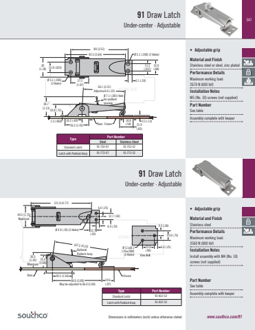 347ACTUAL SIZEDimensions in millimeters (inch) unless otherwise stated91 Draw LatchUnder-center · Adjustable • Adjustable gripMaterial and FinishStainless steel or steel, zinc platedPerformance Details Maximum working load:2670 N (600 lbf)Installation NotesM5 (No. 10) screws (not supplied) Part NumberSee tableAssembly complete with keeperType Part NumberSteel Stainless SteelStandard Latch 91-752-07 91-752-52Latch with Padlock Hasp 91-772-07 91-772-5291 Draw LatchUnder-center · Adjustable • Adjustable grip Material and FinishStainless steelPerformance Details Maximum working load:3560 N (800 lbf)Installation NotesInstall assembly with M4 (No. 10) screws (not supplied)Door FrameØ 5.1 (.200) (2 Holes)Ø 5.1 (.200)(2 Holes)92.5 (3.64)27.2(1.07)5.1 (.20)15.9 (.625) 30(1.18)11.1(.437)22.0(.88)28.7(1.13)19.0 (.75)1.5 (.060) 10.2 (.40)36.3 (1.43)14.8(.58) 21.0(.83)2.3 (.13)Ø 7.1 (.281) Holefor padlockshackle56.1 (2.21)Adjusts±0.6 (.23)89 (3.51)www.southco.com/91ACTUAL SIZEPart NumberSee tableAssembly complete with keeperDoor Frame44.5 (1.75)Maximum121.0 (4.77)6.4 (.25)6.4 (.25)12.7(.50)Ø 4.9 (.19) (3 Holes)12.7 (.50)9.5 (.38)23.8(.94)View A-AØ 5.1±0.1 (.20±.004)(3 Holes)6.4 (.25)25.4(1.00)39.5 (1.56)99.0 (3.90)May be adjusted to 66.0 (2.60)24.6(.97)A A30.5(1.20)Maximum107.5 (4.23)19.0 (.75)OptionalPadlock haspDoor Frame44.5 (1.75)Maximum121.0 (4.77)6.4 (.25)6.4 (.25)12.7(.50)Ø 4.9 (.19) (3 Holes)12.7 (.50)9.5 (.38)23.8(.94)View A-AØ 5.1±0.1 (.20±.004)(3 Holes)6.4 (.25)25.4(1.00)39.5 (1.56)99.0 (3.90)May be adjusted to 66.0 (2.60)24.6(.97)A A30.5(1.20)Maximum107.5 (4.23)19.0 (.75)OptionalPadlock haspDoor Frame44.5 (1.75)Maximum121.0 (4.77)6.4 (.25)6.4 (.25)12.7(.50)Ø 4.9 (.19) (3 Holes)12.7 (.50)9.5 (.38)23.8(.94)View A-AØ 5.1±0.1 (.20±.004)(3 Holes)6.4 (.25)25.4(1.00)39.5 (1.56)99.0 (3.90)May be adjusted to 66.0 (2.60)24.6(.97)A A30.5(1.20)Maximum107.5 (4.23)19.0 (.75)OptionalPadlock haspType Part NumberStandard Latch 91-812-52Latch with Padlock Hasp 91-832-52