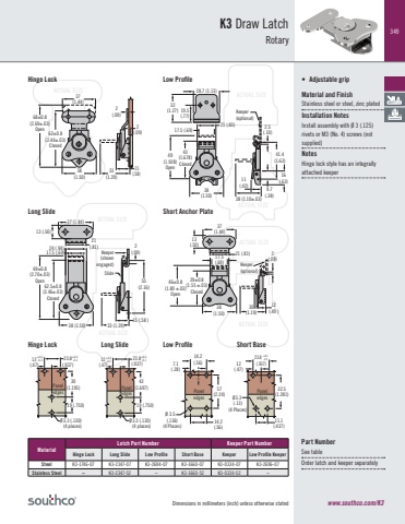 349ACTUAL SIZE ACTUAL SIZEACTUAL SIZEACTUAL SIZEACTUAL SIZEACTUAL SIZEACTUAL SIZEDimensions in millimeters (inch) unless otherwise stated• Adjustable grip Material and FinishStainless steel or steel, zinc platedInstallation NotesInstall assembly with Ø 3 (.125)rivets or M3 (No. 4) screws (not supplied) NotesHinge lock style has an integrally attached keeperK3 Draw LatchRotary 62±0.8(2.44±.03)Closed37(1.44)38(1.50)33(1.29)15(.58) 2(.09) 68±0.8(2.69±.03)Open 2(.09)23.8(.937)12(.47)30(1.195)19 (.750)3.3 (.130)(4 places)Ø+0.1-0.1 +0.1-0.2PaneledgesHinge Lock38 (1.50)69±0.8(2.70±.03)Open62.5±0.8(2.46±.03)Closed15 (.58 )33 (1.29)55(2.16)2(.09) 24 (.94)17.5 (.69)21(.81)13 (.50)37 (1.44)Keeper(shownengaged)SlideLong Slide23.8(.937)12(.47)43(1.697)19 (.750)3.3 (.130)(4 places)Ø+0.1-0.1 +0.1-0.2PaneledgesKeeper(optional)38(1.50)49(1.928)Open43(1.678)Closed9.7(.38)16(.63)28 (1.10±.03)2.5(.10)41.4(1.63)17.5 (.69)21 (.83)32(1.27)28.7 (1.13)19.5(.77)7.1(.28)14.2(.56)57(2.24)14.2(.56)3.5(.136)(4 Places)ØPaneledges11(.42)38(1.50)46±0.8(1.80 ±.03)Open39±0.8(1.55 ±.03)Closed12(.49 )30(1.19)2(.09) 17.5(.69)21 (.81)13(.50)37(1.44)Keeper(optional)12(.47)23.8 (.937)32.5(1.281)11.1(.437) 3.3(.13)(4 Places)+0.1-0.1ØPaneledgesKeeper(optional)38(1.50)49(1.928)Open43(1.678)Closed9.7(.38)16(.63)28 (1.10±.03)2.5(.10)41.4(1.63)17.5 (.69)21 (.83)32(1.27)28.7 (1.13)19.5(.77)7.1(.28)14.2(.56)57(2.24)14.2(.56)3.5(.136)(4 Places)ØPaneledges11(.42)Low ProfileShort Anchor PlateMaterialLatch Part Number Keeper Part NumberHinge Lock Long Slide Low Profile Short Base Keeper Low Profile KeeperSteel K3-1746-07 K3-2347-07 K3-2694-07 K3-1660-07 K3-0334-07 K3-2696-07Stainless Steel ~ K3-2347-52 ~ K3-1660-52 K3-0334-52 ~Part NumberSee tableOrder latch and keeper separatelywww.southco.com/K3Hinge Lock Long Slide Low Profile Short Base