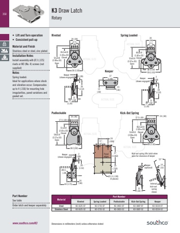350ACTUAL SIZEACTUAL SIZEACTUAL SIZEACTUAL SIZEACTUAL SIZEDimensions in millimeters (inch) unless otherwise statedK3 Draw LatchRotary• Lift and Turn operation • Consistent pull-upMaterial and FinishStainless steel or steel, zinc plated Installation NotesInstall assembly with Ø 3 (.125)rivets or M3 (No. 4) screws (not supplied) NotesSpring loaded:Ideal for applications where shock and vibration occur. Compensates up to 4 (.156) for mounting hole irregularities, panel variations and gasket set. Part NumberSee tableOrder latch and keeper separately38 (1.50)52±0.8(2.08±.03)Open46.5±0.8(1.83±.03)Closed24 (.94)15(.58) 33(1.29)39(1.52)2 (.09)17.5(.69)21(.81) 13(.50)37(1.44)Keeper(shown engaged)Riveted Spring LoadedPadlockable Kick-Out Spring38 (1.50)53±0.8(2.07±.03)Open46±0.8(1.82±.03)Closed24 (.94)15(.58 ) 33(1.29)39(1.52)2(.09)17.5(.69)Keeper(shown engaged)2113 (.81)(.50)37(1.44)49 (1.93)17.5 (.69)2(.09)39(1.53)9.5(.38)24 (.94)58±0.8(2.27±.03)Open51±0.8(2.02±.03)Closed24(.94) 44 (1.75)38 (1.50)Ø13 21 (.81)(.50)37 (1.44)Keeper(shown engaged)38 (1.50)52±0.8(2.08±.03)Open46.5±0.8(1.83±.03)Closed24 (.94)15(.58 )17.5 (.69)15°14(.53)Kick-out spring lifts latch when open for clearance of keeper Keeper(optional)21(.81)13(.50)37 (1.44)Internalkick-outspringshown2412 (.938)(.47)27(1.063)19(.750)3.3 (.130)(4 places)ØPaneledges21(.81) 13(.50)37(1.44)KeeperMaterialPart NumberRiveted Spring Loaded Padlockable Kick-Out Spring KeeperSteel K3-1625-07 K3-1735-07 K3-2403-07 K3-1887-07 K3-0334-07Stainless Steel K3-1625-52 K3-1735-52 K3-2403-52 K3-1887-52 K3-0334-52www.southco.com/K3