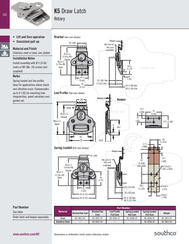 352ACTUAL SIZEACTUAL SIZEACTUAL SIZEDimensions in millimeters (inch) unless otherwise statedK5 Draw LatchRotary• Lift and Turn operation • Consistent pull-upMaterial and FinishStainless steel or steel, zinc plated Installation NotesInstall assembly with Ø 5 (3/16)rivets or M5 (No. 10) screws (not supplied) NotesSpring loaded and low profile:Ideal for applications where shock and vibration occur. Compensates up to 4 (.16) for mounting hole irregularities, panel variations and gasket set.Part NumberSee tableOrder latch and keeper separatelyRiveted (hex cam shown)Spring Loaded (flat cam shown)Low Profile (flat cam shown)KeeperMaterialPart NumberRiveted Hex Cam Riveted Flat CamLow Profile Flat CamSpring Loaded Hex CamSpring Loaded Flat Cam KeeperSteel K5-2812-07 K5-2857-07 K5-2814-07 K5-2858-07 K5-2856-07 K5-2811-07Stainless Steel ~ K5-2857-52 ~ ~ K5-2856-52 K5-2811-5222 (.88)41 (1.62) 70 (2.75) KeeperHex cam orflat camavailable83 (3.25) 24 (.95) Hex20 (.77) Flat44 (1.72) Flat45 (1.78) Hex37.5 (1.48)12.7(.500)96±1.5(3.79±.06)Open87±1.5 (3.43±.06)Closed21(.81)51(2.00)44(1.75)62(2.438)(see note) 5.4 (.205 )35(1.375)9.5±0.1(.375)19±0.1(.750)17.5(.688)12.7(.500)28.5(1.125)±0.1±.00487±1.5Closed96±1.5Open418344.5 9Keeper70 14.0Flat28Slide22 (.88)41 (1.62) 70 (2.75) KeeperHex cam orflat camavailable83 (3.25) 24 (.95) Hex20 (.77) Flat44 (1.72) Flat45 (1.78) Hex37.5 (1.48)12.7(.500)96±1.5(3.79±.06)Open87±1.5 (3.43±.06)Closed21(.81)51(2.00)44(1.75)62(2.438)(see note) 5.4 (.205 )35(1.375)9.5±0.1(.375)19±0.1(.750)17.5(.688)12.7(.500)28.5(1.125)±0.1±.00487±1.5(3.43±.06)Closed96±1.5(3.79±.06)Open41.5(1.63)70(2.75) 43 (1.68) Hex 22 (.88)44.5(1.75)40 (1.59) FlatHex cam orflat camavailable17 (.67)9(.35)Flat 21 (.83) HexKeeperwww.southco.com/K5