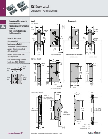 354ACTUAL SIZE ACTUAL SIZEDimensions in millimeters (inch) unless otherwise statedR2 Draw LatchConcealed · Panel Fastening • Provides a high strength concealed joint• Operates quickly with a hex wrench• Self adjusts to ensure a tight connectionMaterial and FinishSteel, galvanized Performance DetailsTab, Shallow, and Mortise Mount: Average ultimate tensile load:6200 N (1400 lbf)Average ultimate shear load:8900 N (2000 lbf) Front Mount: Average ultimate tensile load: 4000 N (900 lbf)Shear LoadTensileLoadTensileLoadShear Loadwww.southco.com/R2Latch ReceptacleTab MountFront/Rear MountMortise Mount30.7(1.21)16.4(.65)95.3(3.75)127(5.00)149.4(5.88)R 12.2(.48)31.8(1.25)95.3(3.75)127(5.00)149.4(5.88)11.1(.44)16.4(.65)8 (5/6) Hex wrench opening2X 5.2 (.21)82° Countersink (from opposite side)2X 5.2 (.21)82° Countersink (from opposite side)44.4(1.75)*12.7(.50)41.8(1.64)16.4(.64)85.7(3.38)43.7(1.72)11.2(.44)2X Ø 6.6(.26)16.4(.64)41.8(1.64)85.7(3.37)44.4(1.75)4X Ø 5.5(.22)2X Ø 6.6(.26)4X Ø 5.5(.22)ABCDE*Typical on latch and receptacle8 (5/6)Hex wrench opening23.9 (.94)57.2(2.25)85.8(3.38)2X 6.6(.26)4X 6.6(.26) 16.4(.64)43.7(1.72)35.8(1.41)11.2(.44)57.2(2.25)85.8(3.38)2X 6.6(.26)16.4(.64) 32.3(1.27) 8 (5/6)Hex wrench opening