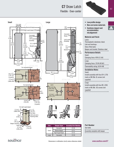 357ACTUAL SIZEACTUAL SIZEDimensions in millimeters (inch) unless otherwise statedC7 Draw LatchFlexible · Over-center• Low profile design• Non-corrosive materials• Cushions impact and accommodates misalignmentMaterial and FinishLatch: Thermoplastic elastomer, blackLink and bushings: Glass-filled nylonKeeper and bracket: Stainless steel Performance Details Small: Clamping force: 49 N (11 lbf)Large:Clamping force: 176 N (40 lbf)Flammability rating: UL94-HBInstallation NotesSmall: Install assembly with four Ø 4 (.170) rivets or M4 (No. 8) screws (not supplied)Large: Install assembly with four Ø5 (.204) rivets or M5 (No. 10) screws (not supplied) Part NumberSee tableAssembly complete with keeperSize Keeper Style Assembly Part NumberSmallConcealed C7-10Reverse Keeper C7-11Right Angle Keeper C7-12Large Concealed C7-20105.5(4.16)Latched97.5(3.83)UnlatchedConcealed Keeper2.4(.09)19.6(.77)28.7(1.13)31.8(1.25)118.6(4.67)129(5.08)Reversed keeper Right angle keeper 21.8 (.86)Bracket12.2 (.48)LatchAssembly 164(6.45)Latched151(5.95)UnlatchedLatchAssembly18.3(.72)Bracket26.2(1.03)29.5(1.16)45.7(1.80)1.6 (.06)2.4(.09)15.1(.60)ConcealedKeeperSmall LargeLatch Keeper31.8±3(1.25±.12)9.5±0.1(.375±.005) 17.5±0.1(.688±.005)For concealed keeperØ 4.3 (.170 )(4 places)+.003-.001+0.1-0.0Latch Keeper12.7±0.1(.500±.005)17.5±0.1(.688±.005)6.4±0.5(.25±.02)79±3(3.11±.12)For reversed keeperØ 4.3 (.170 )(4 places)+.003-.001+0.1-0.0Latch KeeperØ 5.2±0.1(.204±.003)(4 places)12.7±0.1(.500±.005)76.2±6.4(3.00±.25)12.7±0.1(.500±.005)17.5±0.1(.688±.005)72±3(2.82±.12)Keeper mountingholes 4.3.17012.7±0.1(.500±.005)6.4±0.5(.25±.02)Four holesLatch sub-ass'ymounting holesØFor right angle keeper+0.1-0.0+.003-.001 ( )12(.46+6-0+.25-.00 )www.southco.com/C7
