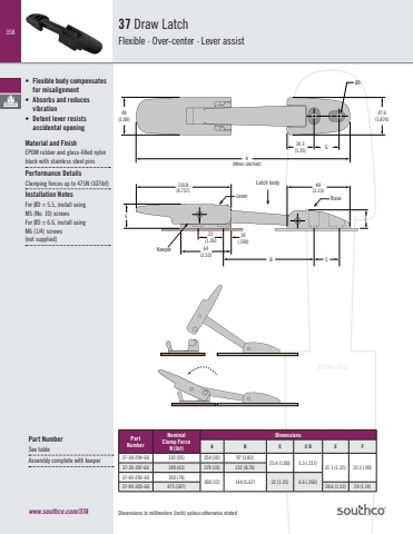 358Dimensions in millimeters (inch) unless otherwise stated37 Draw LatchFlexible · Over-center · Lever assist• Flexible body compensates for misalignment• Absorbs and reduces vibration• Detent lever resists accidental openingMaterial and FinishEPDM rubber and glass-filled nylon black with stainless steel pins Performance Details Clamping forces up to 475N (107lbf)Installation NotesFor ØD = 5.5, install using M5 (No. 10) screwsFor ØD = 6.6, install using M6 (1/4) screws(not supplied)Part NumberSee tableAssembly complete with keeperPart NumberNominal Clamp Force N (lbf)DimensionsA B C Ø D E F37-30-294-60 110 (25) 254 (10) 97 (3.82)25.4 (1.00) 5.5 (.217)37-30-297-60 190 (43) 379 (15) 222 (8.74) 31.1 (1.22) 23.5 (.93)37-40-295-60 350 (79)300 (12) 144 (5.67) 32 (1.25) 6.6 (.260)37-40-305-60 475 (107) 38.6 (1.52) 29 (1.14)www.southco.com/37AACTUAL SIZE48(1.89)34.3(1.35) G47.6(1.874)ØDE120.8(4.757)64(2.52) B C32(1.26)10(.394)80(3.15)FA(When latched)Latch bodyBase LeverKeeper4834.348E1216432 1080FØDACB