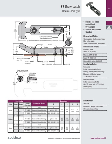 359Dimensions in millimeters (inch) unless otherwise statedACTUAL SIZE(SMALL)• Flexible one piece molded latch• UV resistant• Absorbs and reduces vibrationMaterial and FinishThermoplastic elastomer and glassfilled nylon, blackScre Stainless steel, passivatedPerformance Details Clamping forceSmall: 58 N (13 lbf) Medium: 84 N (19 lbf)Large: 98 N (22 lbf)Flammability rating: UL94-HBInstallation NotesConcealed:Install assembly with thread forming screws (order separately).Maximum tightening torque 2.0 Nm (18 inlbf) Front installation:Install assembly with M5 (No. 10) screw or Ø 5 (3/16) rivet (not supplied) F7 Draw LatchFlexible · Pull type47(1.85)21(.82)15(.60)18(.71)KeeperHandle(4 Places)Bracket20.3(.80)(Ref. when latched to recommended mounting dimension)Concealed Version9.5 ±0.2(.375 ±.010)Ø 10.2 (.40) Counterbore(front installation only)AB±3.2 (.13)DCØ 5.2 (.205 )+0.1-0.0 +.003-.00019±0.2 (.750±.010) 5.1 (.20)E9.5(.38)Ø 8 (.32)2.8 (.11)Thread forming screwNo. 2 Phillips Recess15.9 (.63) or25.4 (1.0)Part NumberInstallation Method Dimensions Size Latch Keeper Screws (3 per bag) E A B C DSmallF7-530 F7-537 ~ Front ~112(4.81)41(1.6)25.4(1.00)31(1.23) F7-540 F7-547 F7-548-3 Concealed (thread forming) up to 8.0 (.32)F7-558-3 Concealed (thread forming) 8.1 - 17.5 (.32 - .69)MediumF7-630 F7-537 ~ Front ~167(6.6)72(2.83)32(1.25)29(1.13) F7-640 F7-547F7-548-3 Concealed (thread forming) up to 8.0 (.32)F7-558-3 Concealed (thread forming) 8.1 - 17.5 (.32 - .69)LargeF7-730 F7-537 ~ Front ~221(8.7)117(4.6)32(1.25)29(1.13) F7-740 F7-547F7-548-3 Concealed (thread forming) up to 8.0 (.32)F7-558-3 Concealed (thread forming) 8.1 - 17.5 (.32 - .69)Part NumberSee tableOrder latch, keeper and screws (if required) separatelywww.southco.com/F7