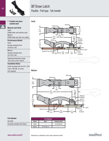 360ACTUAL SIZEACTUAL SIZEDimensions in millimeters (inch) unless otherwise stated• Flexible one piece molded latchMaterial and FinishSmall: EPDM rubber and stainless steelMedium: EPDM rubber and steel, zinc platedPerformance Details Small:Average clamping force: 20.9 N (4.7 lbf)Medium:Average clamping force: 26.2 N (5.9 lbf)Operating temperature range:-20ºC (0ºF) to 95ºC (200ºF)Installation NotesInstall assembly with four Ø 3 (.125)rivets or M3 (No. 4) screws (not supplied)37 Draw LatchFlexible · Pull type · Tab handlePart NumberSeries Steel Stainless SteelSmall ~ 37-10-051-20Medium 37-10-061-10 ~Part NumberSee tableAssembly complete with keeper7.1(.28)19.8(.78)11.1(.44)17.5(.69)12.7(.50)HandleWhen latchedKeeperRivetBracketAlternatemountingposition7.1(.28)13.5(.53) Ø 3.2(.125)(4 places)Alignment lug8.4(.33)52.4(2.06)1 (.042)SmallMediumKeeperRivet16.7(.66)23.9(.94)Alignment lugWhen latched9.5(.38) 10.3(.41)17.9(.70)25.4(1.00)10.3(.41)12.7(.50)AlternatemountingpositionBracketØ 3.2(.125)(4 places)68.3(2.69)1 (.042)www.southco.com/37
