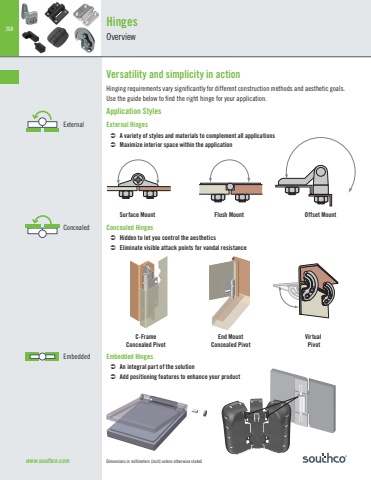 368www.southco.comEmbeddedConcealedDimensions in millimeters (inch) unless otherwise statedHingesOverviewVersatility and simplicity in actionHinging requirements vary significantly for different construction methods and aesthetic goals. Use the guide below to find the right hinge for your application. Application StylesExternal Hinges A variety of styles and materials to complement all applications Maximize interior space within the applicationConcealed Hinges Hidden to let you control the aesthetics Eliminate visible attack points for vandal resistanceEmbedded Hinges An integral part of the solution Add positioning features to enhance your productSurface Mount Flush Mount Offset MountC-Frame End Mount VirtualConcealed Pivot Concealed Pivot Pivot External