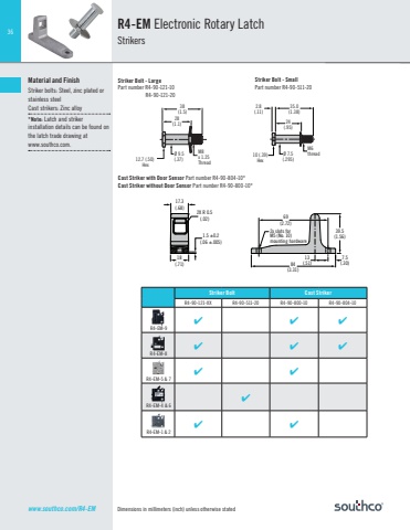 36Dimensions in millimeters (inch) unless otherwise statedStriker Bolt - LargePart number R4-90-121-10 R4-90-121-2012.7 (.50) HexØ 9.5(.37)M8 x 1.25Thread38(1.5)28(1.1)17.3(.68) 2X R 0.5(.02)1.5 ±0.2(.06 ±.005)18(.71)R4-EM Electronic Rotary LatchStrikers Material and FinishStriker bolts: Steel, zinc plated or stainless steelCast strikers: Zinc alloy*Note: Latch and striker installation details can be found on the latch trade drawing at www.southco.com.www.southco.com/R4-EMStriker Bolt - SmallPart number R4-90-511-202.5 (.10)12.9(.51)11.2 (.44)42.5(1.67)8.8 (.34)5.8 (.23)65.3(2.57)6.6(.26)Ø 3.4 (.13)18.2 (.72)18 (.71)62.3 (2.45)12.5 (.49)150 (5.91)Mounting holes(see Part Number table) Mechanical triggerOptional cablemounting kitStriker bolt(sold separately)3 (.12) 39.68 (1.56)16.8 (.66)16(.63)12.5(.49)150 (5.9)11 2 3PIN 3PIN 2PIN 1 PIN 1 IndicatorPIN 6PIN 5PIN 435.0(1.38)Ø 7.5(.295)24(.95)M6thread2.8(.11)10 (.39)HexCast Striker with Door Sensor Part number R4-90-804-10*Cast Striker without Door Sensor Part number R4-90-800-10*39.5(1.56)13(.51)7.584 (.30)(3.31)69(2.72)2x slots for M5 (No. 10) mounting hardwareStriker Bolt Cast StrikerR4-90-121-XX R4-90-511-20 R4-90-800-10 R4-90-804-10R4-EM-9 R4-EM-8 R4-EM-5 & 7 R4-EM-4 & 6R4-EM-1 & 2