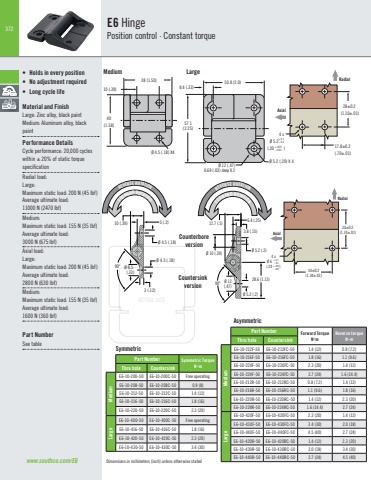 372ACTUAL SIZE ACTUAL SIZEPart Number Symmetric Torque Nm Thru hole CountersinkMediumE6-10-200-50 E6-10-200C-50 Free operatingE6-10-208-50 E6-10-208C-50 0.9 (8)E6-10-212-50 E6-10-212C-50 1.4 (12)E6-10-216-50 E6-10-216C-50 1.8 (16)E6-10-220-50 E6-10-220C-50 2.3 (20)LargeE6-10-400-50 E6-10-400C-50 Free operatingE6-10-416-50 E6-10-416C-50 1.8 (16)E6-10-420-50 E6-10-420C-50 2.3 (20)E6-10-430-50 E6-10-430C-50 3.4 (30)Part Number Forward Torque N•mReverse torque Nm Thru hole CountersinkMediumE6-10-212F-50 E6-10-212FC-50 1.4 (12) 0.8 (7.2)E6-10-216F-50 E6-10-216FC-50 1.8 (16) 1.1 (9.6)E6-10-220F-50 E6-10-220FC-50 2.3 (20) 1.4 (12)E6-10-224F-50 E6-10-224FC-50 2.7 (24) 1.6 (14.4)E6-10-212R-50 E6-10-212RC-50 0.8 (7.2) 1.4 (12)E6-10-216R-50 E6-10-216RC-50 1.1 (9.6) 1.8 (16)E6-10-220R-50 E6-10-220RC-50 1.4 (12) 2.3 (20)E6-10-224R-50 E6-10-224RC-50 1.6 (14.4) 2.7 (24)LargeE6-10-420F-50 E6-10-420FC-50 2.3 (20) 1.4 (12)E6-10-430F-50 E6-10-430FC-50 3.4 (30) 2.0 (18)E6-10-440F-50 E6-10-440FC-50 4.5 (40) 2.7 (24)E6-10-420R-50 E6-10-420RC-50 1.4 (12) 2.3 (20)E6-10-430R-50 E6-10-430RC-50 2.0 (18) 3.4 (30)E6-10-440R-50 E6-10-440RC-50 2.7 (24) 4.5 (40)4.5 (.18)8.4 (.33)50.8 (2.0)Ø 5.2 (.20) X 412.7 (.50)4 xØ 6 (.24 )57.1(2.25)34±0.2(1.34±.01)34±0.2(1.34±.01)28.6 (1.13)+ 0.1 - 0.0+ .005 - .000Ø 12 (.47)0.69 (.03) deep X 2AxialRadialREVERSE ROTATIONFORWARD ROTATION4.5 (.18)8.4 (.33)50.8 (2.0)Ø 5.2 (.20) X 412.7 (.50)4 xØ 6 (.24 )57.1(2.25)34±0.2(1.34±.01)34±0.2(1.34±.01)28.6 (1.13)+ 0.1 - 0.0+ .005 - .000Ø 12 (.47)0.69 (.03) deep X 2AxialRadialREVERSE ROTATIONFORWARD ROTATIONwww.southco.com/E617.8±0.2(.70±.01)10 (.39)10.0 (.39)3 (.11) 4 x Ø 5.2 (.20 )Ø 4.5 (.18) X428±0.2 (1.10±.01)38 (1.50)20 (.79)40(1.58)+ 0.1 - 0.0 +.005 - .000AxialRadialREVERSE ROTATIONFORWARD ROTATION17.8±0.2(.70±.01)10 (.39)10.0 (.39)3 (.11) 4 x Ø 5.2 (.20 )Ø 4.5 (.18) X428±0.2 (1.10±.01)38 (1.50)20 (.79)40(1.58)+ 0.1 - 0.0 +.005 - .000AxialRadialREVERSE ROTATIONFORWARD ROTATIONREVERSE ROTATIONFORWARD ROTATION3 (.12)5 (.2)Ø 4.5 (.18)Ø 4.5 (.18)Ø 8.5 (.33)10 (.39)90º17.8±0.2(.70±.01)10 (.39)10.0 (.39)3 (.11) 4 x Ø 5.2 (.20 )Ø 4.5 (.18) X428±0.2 (1.10±.01)38 (1.50)20 (.79)40(1.58)+ 0.1 - 0.0 +.005 - .000AxialRadialREVERSE ROTATIONFORWARD ROTATIONSymmetricAsymmetricMedium LargeE6 HingePosition control · Constant torque• Holds in every position• No adjustment required• Long cycle lifeMaterial and FinishLarge: Zinc alloy, black paintMedium: Aluminum alloy, black paintPerformance DetailsCycle performance: 20,000 cycles within ± 20% of static torque specificationRadial load: Large:Maximum static load: 200 N (45 lbf)Average ultimate load: 11000 N (2470 lbf)Medium:Maximum static load: 155 N (35 lbf)Average ultimate load: 3000 N (675 lbf)Axial load: Large:Maximum static load: 200 N (45 lbf)Average ultimate load: 2800 N (630 lbf)Medium:Maximum static load: 155 N (35 lbf)Average ultimate load: 1600 N (360 lbf)Part NumberSee tableCounterbore version4.5 (.18)8.4 (.33)50.8 (2.0)Ø 5.2 (.20) X 412.7 (.50)4 xØ 6 (.24 )57.1(2.25)34±0.2(1.34±.01)34±0.2(1.34±.01)28.6 (1.13)+ 0.1 - 0.0+ .005 - .000Ø 12 (.47)0.69 (.03) deep X 2AxialRadialREVERSE ROTATIONFORWARD ROTATION12.7 (.5) 6.4 (.25)3.8 (.15)Ø 5.2 (.2)28.6 (1.13)Ø 10 (.39)Ø 5.2 (.2)Ø 10.5 (.41) 2x90ºØ 12(.47) 90ºCountersink versionDimensions in millimeters (inch) unless otherwise stated