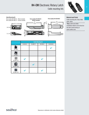 37Dimensions in millimeters (inch) unless otherwise stated39.7 (1.56)16.8 (.66)11.5 (.45)Cable Mounting KitPart number R4-EM-52 – Rivets includedPart number R4-EM-72 – Screws included39.7 (1.56)16.8 (.66)11.5 (.45)Cable Mounting KitR4-EM-52 R4-EM-72 R4-EM-87 R4-EM-952R4-EM-9R4-EM-8R4-EM-5 & 7 R4-EM-4 & 6R4-EM-1 & 2 16.6(.65)61(2.4)12(.5)55.7(2.19)16.9(.67)14.7(.58)Part number R4-EM-87 –Rivets includedPart number R4-EM-95216.6(.65)61(2.4)12(.5)55.7(2.19)16.9(.67)14.7(.58)R4-EM Electronic Rotary Latch Cable mounting kitsMaterial and FinishCable mounting kits: Glass-fi lled nylon, black*Note: Latch and striker installation details can be found on the latch trade drawing at www.southco.com.