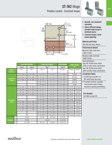 382B9±0.1(.354±.004)4 x Ø 3.1±0.1(.122±.004) 16 (.63)8±0.1(.315±.004)B±0.1(±.004)9±0.1(.354±.004)Hinge centerlineAxialRadialTAMANHO REALLow Profile Adapter Heavy Duty Adapter Offset Adapter Static TorqueType A Type B Type T Type W NmMount HardwareNo. 4 No. 4 No. 4 M3 M3 or No. 4 Forward ReverseSymmetric TorqueST-7A2-30SA-33 ST-7A2-30SB-33 ST-7A2-30ST-33 ST-7A3-30ST-33 ST-7A3-30SW-33 0.34 (3)ST-7A2-45SA-33 ST-7A2-45SB-33 ST-7A2-45ST-33 ST-7A3-45ST-33 ST-7A3-45SW-33 0.51 (4.5)ST-7A2-60SA-33 ST-7A2-60SB-33 ST-7A2-60ST-33 ST-7A3-60ST-33 ST-7A3-60SW-33 0.68 (6)- - ST-7A2-75ST-33 ST-7A3-75ST-33 ST-7A3-75SW-33 0.85 (7.5)- - ST-7A2-90ST-33 ST-7A3-90ST-33 ST-7A3-90SW-33 1.0 (9)Asymmetric TorqueST-7A2-30FA-33 ST-7A2-30FB-33 ST-7A2-30FT-33 ST-7A3-30FT-33 ST-7A3-30FW-33 0.34 (3) 0.29 (2.6)ST-7A2-40FA-33 ST-7A2-40FB-33 ST-7A2-40FT-33 ST-7A3-40FT-33 ST-7A3-40FW-33 0.45 (4) 0.36 (3.2)ST-7A2-50FA-33 ST-7A2-50FB-33 ST-7A2-50FT-33 ST-7A3-50FT-33 ST-7A3-50FW-33 0.56 (5) 0.45 (4)ST-7A2-60FA-33 ST-7A2-60FB-33 ST-7A2-60FT-33 ST-7A3-60FT-33 ST-7A3-60FW-33 0.68 (6) 0.52 (4.6)- - ST-7A2-70FT-33 ST-7A3-70FT-33 ST-7A3-70FW-33 0.79 (7) 0.6 (5.2)- - ST-7A2-90FT-33 ST-7A3-90FT-33 ST-7A3-90FW-33 1.02 (9) 0.75 (6.6)ST-7A2-30RA-33 ST-7A2-30RB-33 ST-7A2-30RT-33 ST-7A3-30RT-33 ST-7A3-30RW-33 0.29 (2.6) 0.34 (3)ST-7A2-40RA-33 ST-7A2-40RB-33 ST-7A2-40RT-33 ST-7A3-40RT-33 ST-7A3-40RW-33 0.36 (3.2) 0.45 (4)ST-7A2-50RA-33 ST-7A2-50RB-33 ST-7A2-50RT-33 ST-7A3-50RT-33 ST-7A3-50RW-33 0.45 (4) 0.56 (5)ST-7A2-60RA-33 ST-7A2-60RB-33 ST-7A2-60RT-33 ST-7A3-60RT-33 ST-7A3-60RW-33 0.52 (4.6) 0.68 (6)- - ST-7A2-70RT-33 ST-7A3-70RT-33 ST-7A3-70RW-33 0.6 (5.2) 0.79 (7)- - ST-7A2-90RT-33 ST-7A3-90RT-33 ST-7A3-90RW-33 0.75 (6.6) 1.02 (9)DimensionA 15 (.59) 15 (.59) 16.3 (.64) 16.3 (.64)B 7.8 (.31) 7.8 (.31) 11.35 (.45)C 25.2 (.99) 24.7 (.97) 26 (1.02) 28.7 (1.57)www.southco.com/STST-7A2 HingePosition control · Constant torquePart NumberSee table on page 365• Smooth, zero backlash operation• Space efficient design provides high torque in minimum space• Constant torque, never needs adjustingMaterial and FinishZinc alloy and steel, natural Performance DetailsMaximum static radial load:770N (173 lbf)Maximum static axial load:730N (164 lbf)Cycle performance:Type A/B: 30,000 cycles within ±20% of static torque specificationType T/W: 50,000 cycles within ±20% of static torque specificationInstallation Notes1. Install hinge using No. 4 orM3 socket head cap screw.2. For proper function, assembly must include a pair of hinges, mounted in opposing orientations.Dimensions in millimeters (inch) unless otherwise stated