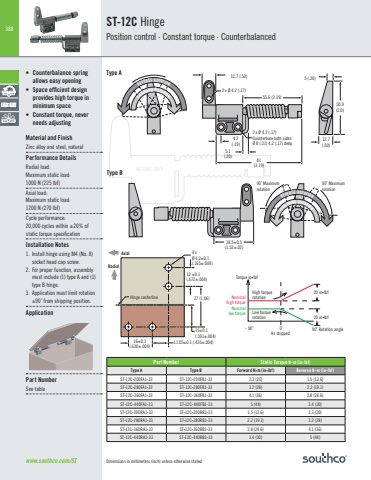 388Part Number Static Torque Nm (inlbf)Type A Type B Forward N•m (in•lbf) Reverse Nm (inlbf)ST-12C-200FA1-33 ST-12C-200FB1-33 2.3 (20) 1.5 (13.6)ST-12C-280FA1-33 ST-12C-280FB1-33 3.2 (28) 2.2 (19.1)ST-12C-360FA1-33 ST-12C-360FB1-33 4.1 (36) 2.8 (24.6)ST-12C-440FA1-33 ST-12C-440FB1-33 5 (44) 3.4 (30)ST-12C-200RA1-33 ST-12C-200RB1-33 1.5 (13.6) 2.3 (20)ST-12C-280RA1-33 ST-12C-280RB1-33 2.2 (19.1) 3.2 (28)ST-12C-360RA1-33 ST-12C-360RB1-33 2.8 (24.6) 4.1 (36)ST-12C-440RA1-33 ST-12C-440RB1-33 3.4 (30) 5 (44)ACTUAL SIZE20 in•lbf20 in•lbfTorque in•lbfHigh torque rotationLow torque rotation- 90˚ 0˚ 90˚ Rotation angleNominallow torqueNominalhigh torqueAs shippedwww.southco.com/ST38.5±0.5(1.52±.02)2 x Ø 4.2 (.17)2 x Ø 4.2 (.17)Counterbore both sidesØ 8 (.31) 4.2 (.17) deep55.6 (2.19)12.7 (.50)81(3.19)5.1(.20)4.7(.19)12.7(.50)5 (.20)50.9(2.0)90˚ Maximumrotation90˚ MaximumrotationREVERSE ROTATIONFORWARD ROTATIONREVERSE ROTATIONFORWARD ROTATION12 ±0.1(.472±.004)4 x Ø 4.2±0.1(.165±.004) 27 (1.06)15±0.1(.591±.004)11.05±0.1 (.435±.004) 16±0.1(.630±.004)Hinge centerlineAxialRadialType AType BDimensions in millimeters (inch) unless otherwise stated• Counterbalance spring allows easy opening• Space efficient design provides high torque in minimum space• Constant torque, never needs adjustingMaterial and FinishZinc alloy and steel, naturalPerformance DetailsRadial load:Maximum static load:1000 N (225 lbf)Axial load:Maximum static load:1200 N (270 lbf)Cycle performance:20,000 cycles within ±20% of static torque specificationInstallation Notes1. Install hinge using M4 (No. 8)socket head cap screw.2. For proper function, assembly must include (1) type A and (1)type B hinge.3. Application must limit rotation±90˚ from shipping position.ApplicationPart NumberSee tableST-12C HingePosition control · Constant torque · Counterbalanced