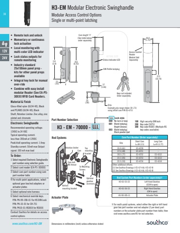 38Dimensions in millimeters (inch) unless otherwise statedPart Number SelectionACTUAL SIZEH3-EM Modular Electronic Swinghandle Modular Access Control Options Single or multi-point latching• Remote lock and unlock• Momentary or continuous lock actuation• Local monitoring with multi-color LED indicator• Lock status outputs for remote monitoring• Industry standard 25x150mm panel prep - kits for other panel preps available• Integral key lock for manual over-ride• Combine with easy install modular Reader (See EA-P5-30XXX RFID Card Readers. Material & FinishGlass-filled nylon (UL94-V0), Black and PC/ABS (UL94-V0), BlackShaft, Rotation Limiter: Zinc alloy, zinc plated and chromateElectronic SwinghandleRecommended operating voltage:12VDC to 24 VDCTypical operating current:less than 200mA at 12VDCPeak/stall operating current: 1 Amp Standby current: 50mA max Output signal: 100 mA max loadTo Order:1 Select required Electronic Swinghandle part number using selection guide.2 Select card reader (EA-P5-30XXX)3 Select cam part number using cam part number table4 For multi-point applications, select optional gear box/rod adapters or actuator plates5 Select optional wire harness6 Select mechanical override keys.P/N: PK-99-198-01 For HS DIN Lock P/N: PK-10-01 for CH-751 P/N: PK10-01-RSXXX for RSXXX Contact Southco for details on access control options12V24Vwww.southco.com/H3-EMCam Part Number (Order seperately)Grip Short CamL=38 (1.5)Long CamL=45 (1.77)15.5 (.61) E5-6710 -17.5 (.69) E5-6711 -19.5 (.77) E5-6712 E5-611221.5 (.85) E5-6713 E5-611323.5 (.93) E5-6714 E5-6114Other additional offsets:(1) See Southco Drawings J-E5-67-A & J-E5-67-B(2) See Southco Drawings J-E5-61-A & J-E5-61-BRod System Part Numbers (order seperately)†H3-61-55-33 Left Hand Gearbox (CCW to open)H3-61-56-33 Right Hand Gearbox (CW to open)A5-90-105-11 Actuator Plate Actuator PlateRod Systems† For multi-point systems, select either the right or left hand gear box part number and rod adaptor (2 per door) part numbers or the actuator plate part number from table, then visit www.southco.com/A5 for rod selection.Rotation limiterCam boltM6 thread5x MountingScrewsBottommounting bracketOptionalgearboxaccessoryCamTop mountingbracketH3 - EM - 70000 - LLL100 High security DIN lock200 Key code CH751300 Key code RS001 (Multiple RS key codes available)LLL Lock style000 No lock or keys001 Blank lockplug: Bright Chrome003 Blank lockplug: Black powder coat24(.94)273(10.74)44.4(1.75)23(.91)151(5.9)163(6.43)37(1.46)Cam length \(See table below) order separatelyStatus Indicator LEDDIN Profile lockplugGrip:Example grip range shown 18 (.71) using offset cam P/N E5-6711Access Control ReaderModule Sold SeparatelyKeys not included. Order separately.