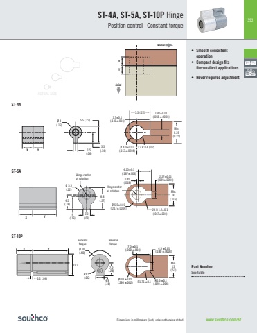 393Hinge center of rotationHinge center of rotation Min.Min.Min.XY1.47±0.01(.058 ±.0004)5.5 (.22)6.35(0.25)Ø 4.0±0.01(.157±.0004)3.7±0.1(.146±.004)2 x R 0.4 (.02)4.25±0.1(.167±.004)0.45(.018)Ø 5.5±0.01(.217±.0004)2.27±0.01(.089±.0004)8(.315)13(.51)2X R 1.2±0.1(.047±.004)R1.75 ±0.1 Ø 10 ±0.05(.390 ±.002)7.5 ±0.1(.300 ±.004) 4.5 ±0.01(.180 ±.0004)R0.5 ±0.1(.020 ±.004)7.2(.28)R1.5 (.06)4.6(.18)Ø 10(.40)12.21.1 (.04)Ø 5.5(.22)6.8(.27)4(.16)2.3(.09)4.5(.18)1.5(.06)5.5 (.22) Ø 4(.16)3.5X Y (.14)XXYYACTUAL SIZEDimensions in millimeters (inch) unless otherwise stated www.southco.com/ST• Smooth consistent operation• Compact design fits the smallest applications• Never requires adjustmentST-4A, ST-5A, ST-10P HingePosition control · Constant torquePart NumberSee tableST-4AST-5AST-10PForwardtorqueReverse torqueAxialRadial
