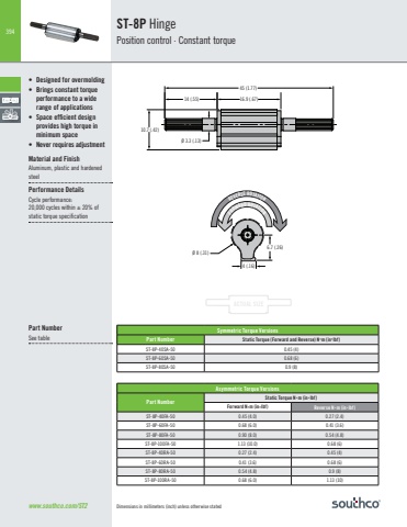 394Symmetric Torque VersionsPart Number Static Torque (Forward and Reverse) N•m (in•lbf)ST-8P-40SA-50 0.45 (4)ST-8P-60SA-50 0.68 (6)ST-8P-80SA-50 0.9 (8)Asymmetric Torque VersionsPart Number Static Torque Nm (inlbf)Forward N•m (in•lbf) Reverse Nm (inlbf)ST-8P-40FA-50 0.45 (4.0) 0.27 (2.4)ST-8P-60FA-50 0.68 (6.0) 0.41 (3.6)ST-8P-80FA-50 0.90 (8.0) 0.54 (4.8)ST-8P-100FA-50 1.13 (10.0) 0.68 (6)ST-8P-40RA-50 0.27 (2.4) 0.45 (4)ST-8P-60RA-50 0.41 (3.6) 0.68 (6)ST-8P-80RA-50 0.54 (4.8) 0.9 (8)ST-8P-100RA-50 0.68 (6.0) 1.13 (10)ACTUAL SIZEØ 8 (.31)4 (.16)6.7 (.26)10.7 (.42)14 (.55)45 (1.77)Ø 3.3 (.13)16.9 (.67)REVERSE ROTATIONFORWARD ROTATIONØ 8 (.31)4 (.16)6.7 (.26)10.7 (.42)14 (.55)45 (1.77)Ø 3.3 (.13)16.9 (.67)REVERSE ROTATIONFORWARD ROTATIONwww.southco.com/ST2 Dimensions in millimeters (inch) unless otherwise statedST-8P HingePosition control · Constant torque• Designed for overmolding• Brings constant torque performance to a wide range of applications• Space efficient design provides high torque in minimum space• Never requires adjustmentMaterial and FinishAluminum, plastic and hardened steel Performance DetailsCycle performance:20,000 cycles within ± 20% of static torque specificationPart NumberSee table