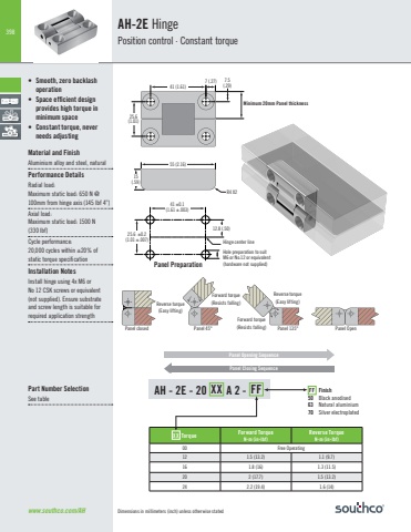 398XX Torque Forward TorqueNm (inlbf)Reverse TorqueNm (inlbf)00 Free Operating12 1.5 (13.2) 1.1 (9.7)16 1.8 (16) 1.3 (11.5)20 2 (17.7) 1.5 (13.2)24 2.2 (19.4) 1.6 (14)www.southco.com/AHAH-2E HingePosition control · Constant torque• Smooth, zero backlash operation• Space efficient design provides high torque in minimum space• Constant torque, never needs adjustingMaterial and FinishAluminium alloy and steel, natural Performance DetailsRadial load:Maximum static load: 650 N @ 100mm from hinge axis (145 lbf 4”)Axial load:Maximum static load: 1500 N(330 lbf)Cycle performance:20,000 cycles within ±20% of static torque specificationInstallation NotesInstall hinge using 4x M6 or No 12 CSK screws or equivalent (not supplied). Ensure substrate and screw length is suitable for required application strengthPart Number SelectionSee tableAH - 2E - 20 XX A 2 - FF FF Finish50 Black anodised63 Natural aluminium70 Silver electroplated7.5(.29) 7 (.27)R4 X212.8 (.50)25.6 ±0.2(1.01 ±.007)41 ±0.1(1.61 ±.003)15(.59)55 (2.16)25.6(1.01)41 (1.61)Panel closedReverse torque(Easy lifting)Reverse torque(Easy lifting)Panel Opening SequencePanel Closing SequenceForward torque(Resists falling)Forward torque(Resists falling) Panel 45° Panel 135° Panel OpenHinge center lineHole preparation to suit M6 or No.12 or equivalent(hardware not supplied)Minimum 20mm Panel thicknessPanel Preparation Dimensions in millimeters (inch) unless otherwise stated
