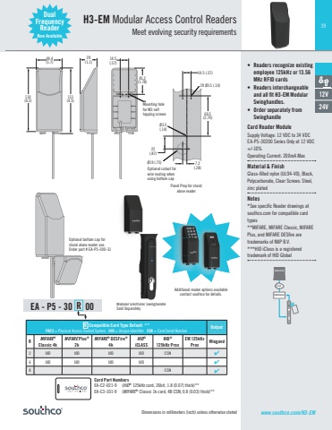 39Dimensions in millimeters (inch) unless otherwise statedH3-EM Modular Access Control Readers Meet evolving security requirements• Readers recognize existing employee 125kHz or 13.56 MHz RFID cards• Readers interchangeable and all fi t H3-EM Modular Swinghandles.• Order separately from SwinghandleCard Reader ModuleSupply Voltage: 12 VDC to 24 VDCEA-P5-30200 Series Only at 12 VDC +/-10%Operating Current: 200mA MaxMaterial & FinishGlass-fi lled nylon (UL94-V0), Black, Polycarbonate, Clear Screws: Steel, zinc platedNotes*See specifi c Reader drawings at southco.com for compatible card types**MIFARE, MIFARE Classic, MIFARE Plus, and MIFARE DESfi re are trademarks of NXP B.V.***HID iClass is a registered trademark of HID Global12V24Vwww.southco.com/H3-EMCard Part NumbersEA-C2-021-9 (HID® 125kHz card, 26bit, 1.8 (0.07) thick)**EA-C3-101-9 (MIFARE® Classic 1k card, 4B CSN, 0.8 (0.03) thick)**R Compatible Card Type Default †** PACS = Physical Access Control System UID = Unique Identifi er CSN = Card Serial Number OutputR MIFARE®Classic 4kMIFARE Plus®2kMIFARE® DESFire®4kHID®iCLASSHID®125kHz ProxEM 125kHz Prox Wiegand2 UID UID UID UID CSN 6 UID UID UID UID 8 CSN EA - P5 - 30 R 00DOOR OPENCONTROLLERLANMounting hole for M3 self tapping screws2X Ø3.5 (.14)14.5 (.57)69.5(2.74)Ø19 (.75)Ø3.5(.14)7.2(.28)22(.87)45.2(1.78)14.5(.57)29(1.1)44.4(1.7)113(4.5)110(4.3)Optional cutout for wire routing when using bottom capOptional bottom cap for stand alone reader use. Order part # EA-P5-300-31Modular Electronic Swinghandle Sold SeparatelyAdditional reader options available contact southco for details.Panel Prep for stand alone readerDual Frequency ReaderNow Available
