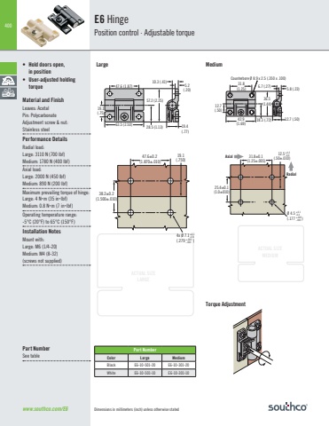 400ACTUAL SIZELARGEACTUAL SIZEMEDIUMwww.southco.com/E631.8(1.25) 6.7 (.27) 5.8 (.23)12.7 (.50)36.5(1.44)18.3 (.72) 42.9(1.69)12.7(.50)Counterbore Ø 8.9 x 2.5 (.350 x .100) 10.3 (.41)5.2(.20)19.4(.77)57.2 (2.25)28.5 (1.13) 63.5 (2.50)19.1(.75)47.6 (1.87)Part NumberColor Large MediumBlack E6-10-501-20 E6-10-301-20White E6-10-501-10 E6-10-301-10Dimensions in millimeters (inch) unless otherwise statedE6 HingePosition control · Adjustable torque• Hold doors open, in position• User-adjusted holding torqueMaterial and FinishLeaves: Acetal Pin: Polycarbonate Adjustment screw & nut: Stainless steelPerformance DetailsRadial load:Large: 3110 N (700 lbf)Medium: 1780 N (400 lbf)Axial load:Large: 2000 N (450 lbf)Medium: 890 N (200 lbf)Maximum prevailing torque of hinge:Large: 4 Nm (35 inlbf)Medium: 0.8 Nm (7 inlbf)Operating temperature range:-5°C (20°F) to 65°C (150°F)Installation NotesMount with:Large: M6 (1/4-20)Medium: M4 (8-32)(screws not supplied)Large Medium31.8±0.1 (1.25±.005)Ø 4.5(.177 )25.4±0.1(1.0±010)+0.1-0.0+.005-.000AxialRadial12.5(.50±.010)+0.219.1 -0.0(.750)47.6±0.2 (1.870±.010)4x Ø 7.1(.279 )38.2±0.2(1.500±.010)+0.1-0.0+.005-.000Mounting screwsnot providedTorque AdjustmentPart NumberSee table