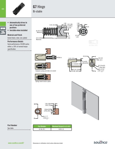 404ACTUAL SIZEPart Number Maximum Torque Nm (inlbf)G7-6A-3P-1 0.035 (.3)www.southco.com/G7 Dimensions in millimeters (inch) unless otherwise statedG7 HingeBi-stable5.90 (.232)4.2±0.05 (.165±0.05)R 0.102.05 (.081 )+0.02-0.00Ø 3.25±0.05 (.128±.002)Ø 5.72 (.225 )+0.05-0.002.00 (.08)3.00 (.12)2.00±0.03(.079±.001)Ø 5.7(.224 )+.02- 0BB1.98(.08)3.92(.15)R0.20Ø 5.65(.22)3.50 (.14)2.00(.08) 2.01 (.08)at bottom of draft6.71(.26) 0.15 (.01) 16.3 (.64)MaximumØ 3.00 (12)MaximumAA+.001-0.00+.002-.000+.001-.00013.30 (.524)15.80 (.622)5.90 (.232)4.2±0.05 (.165±0.05)R 0.102.05 (.081 )+0.02-0.00Ø 3.25±0.05 (.128±.002)Ø 5.72 (.225 )+0.05-0.002.00 (.08)3.00 (.12)2.00±0.03(.079±.001)Ø 5.7(.224 )+.02- 0BB1.98(.08)3.92(.15)R0.20Ø 5.65(.22)3.50 (.14)2.00(.08) 2.01 (.08)at bottom of draft6.71(.26) 0.15 (.01) 16.3 (.64)MaximumØ 3.00 (12)MaximumAA+.001-0.00+.002-.000+.001-.00013.30 (.524)15.80 (.622)5.90 (.232)4.2±0.05 (.165±0.05)R 0.102.05 (.081 )+0.02-0.00Ø 3.25±0.05 (.128±.002)Ø 5.72 (.225 )+0.05-0.002.00 (.08)3.00 (.12)2.00±0.03(.079±.001)Ø 5.7(.224 )+.02- 0BB1.98(.08)3.92(.15)R0.20Ø 5.65(.22)3.50 (.14)2.00(.08) 2.01 (.08)at bottom of draft6.71(.26) 0.15 (.01) 16.3 (.64)MaximumØ 3.00 (12)MaximumAA+.001-0.00+.002-.000+.001-.00013.30 (.524)15.80 (.622)• Automatically drives to one of two preferred positions• Invisible when installedMaterial and FinishAcetal black, steel, zinc platedPerformance DetailsCycle performance: 20,000 cycleswithin ± 20% of normal torque specificationCompress spring and slide in to installSprings back to lock in placeSlide inPart NumberSee table