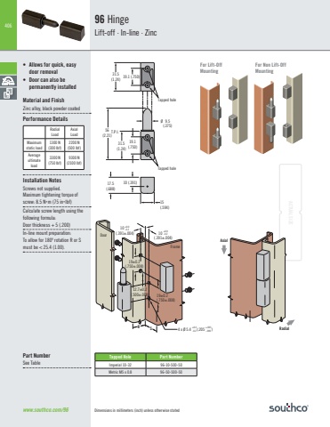 406ACTUAL SIZER S 4 x Ø 5.4 (.205 ) +0.0-0.210 (.391±.004)+0.0-0.210 (.391±.004)+0.0-0.2+.003-.000FrameDoor12.7±0.2(.500±.008) 19±0.2(.750±.008)19±0.2(.750±.008)AxialRadialwww.southco.com/96Tapped Hole Part NumberImperial 10-32 96-10-500-50Metric M5 x 0.8 96-50-500-50Dimensions in millimeters (inch) unless otherwise stated96 HingeLift-off · In-line · Zinc• Allows for quick, easy door removal• Door can also be permanently installedMaterial and FinishZinc alloy, black powder coatedPerformance DetailsInstallation NotesScrews not supplied.Maximum tightening torque of scre 8.5 Nm (75 inlbf)Calculate screw length using the following formula:Door thickness + 5 (.200)In-line mount preparation:To allow for 180º rotation R or S must be < 25.4 (1.00). 10 (.391) 17.5(.688)56(2.21)31.5(1.24)19.1(.750)9.5(.375)Ø31.5(1.24) 19.1 (.750)15(.594)Tapped holeTapped holeT.P.I.Part NumberSee TableRadial LoadAxialLoadMaximum static load1300 N(300 lbf)2200 N(500 lbf)Average ultimate load3300 N(750 lbf)9300 N(2100 lbf)For Non Lift-Off MountingFor Lift-Off Mounting