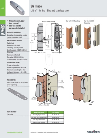 408ACTUAL SIZEMaterial & Finish Part NumberZinc alloy, bright chrome 96-MA-80-10Zinc alloy, black powder coated 96-MA-80-50Zinc alloy, satin chrome 96-MA-80-20Stainless steel, polished 96-MA-80-24www.southco.com/96 Dimensions in millimeters (inch) unless otherwise stated96 HingeLift-off · In-line · Zinc and stainless steel• Allows for quick, easy door removal• Door can also be permanently installedMaterial and FinishZinc alloy, chrome plated, powder coated or stainless steelPerformance DetailsRadial loadMaximum static load: Zinc alloy: 1300 N (300 lbf) Stainless steel: 3000 N (670 lbf)Axial LoadMaximum static load: Zinc alloy: 2200 N (500 lbf) Stainless steel: 5000 N (1120 lbf)Installation NotesScrews not supplied. Attach hinge with four M5 x 0.8Maximum screw length = door (or frame) thickness + 10 (.400)21.6 (.85)54(2.12)9.5 (.37)8.9(.35)84(3.30)M5 X 0.8 Thread 4X19 (.75)19 (.75)19 (.75)18.5 (.73) 16.5 (.65)Door10 (.39 )+0.0-0.2+0-.008 Frame19±0.2(.75±.008)14.4±0.2(.57±.008)10 (.39 )+0.0-0.2+0-.00819±0.2(.75±.008)19±0.2(.75±.008)Ø 5.4 (.21 ) x5+0.0-0.2+0-.008AxialRadialPart NumberSee tableFor Non Lift-Off MountingFor Lift-Off MountingAccessoriesBlack EPDM gasket kit 96-0-73469 (order separately)