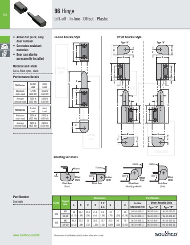 410ACTUAL SIZEACTUAL SIZEACTUALSIZEOFFSET KNUCKLE STYLEHGKBDEJFAHBDEJAFGKBDEFHBDJAFHJAEType \Type \ACTUALSIZEDimensions in millimeters (inch) unless otherwise stated96 HingeLift-off · In-line · Offset · Plastic• Allows for quick, easy door removal• Corrosion-resistant materials• Door can also be permanently installedMaterial and FinishGlass-filled nylon, black Performance Detailswww.southco.com/96Part NumberSee tableIN-LINE KNUCKLE STYLEA HA HJGKEBJCSeries Tapped HoleDimensions Part NumberA B C D E, F & G H J K In-Line Knuckle StyleOffset Knuckle StyleType “A” Type “B”300M5 31(1.22)16.7(.66)14.3(.56)21.5(.84)9.5(.38)19(.75)7(.28)58(2.28)96-50-300-11 96-50-310-11 96-50-320-1110-24 96-10-300-11 96-10-310-11 96-10-320-11400M6 41.3(1.63)22.2(.88)19(.75)28.5(1.13)12.7(.50)25.5(1.00)9.5(.38)78(3.06)96-50-400-11 96-50-410-11 96-50-420-111/4-20 96-10-400-11 96-10-410-11 96-10-420-11FrameFlush Door(Front)FrameOffset DoorFrameFlush Door(Side)FrameOffsetStyleOffset Door(Heavily gasketed)In-lineStyleOffsetStyleOffsetStyleDoor Door Door DoorIn-Line Knuckle Style Offset Knuckle StyleMounting variations300 Series Radial LoadAxialLoadMaximum static load670 N(150 lbf)1560 N(350 lbf)Average ultimate load1100 N(250 lbf)2500 N(550 lbf)400 Series Radial LoadAxialLoadMaximum static load1000 N(225 lbf)2000 N(450 lbf)Average ultimate load1900 N(425 lbf)4900 N(1100 lbf)