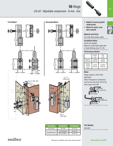 413ACTUALSIZEInstall Style Tapped Hole Part NumberFront mount Thru hole 96-10-572Concealed mount10-32 Imperial 96-10-570M5 x 0.8 Metric 96-50-570Dimensions in millimeters (inch) unless otherwise stated96 HingeLift-off · Adjustable compression · In-line · Zinc• Adjusts to ensure gasket compression• Allows for quick, easy door removalMaterial and FinishZinc alloy, black powder coatedInstallation NotesScrews not supplied.Maximum screw length equals door or frame thickness plus 7.5 (.30)Performance DetailsNotesHinges provide 5 (.20) of total adjustmentEither F Dimension or G dimension must be less than 19.8 (.78) for the door to open a full 180°FrameMin. CompressionMax. CompressionFrame GasketGasketDoorDoor62.5(2.46)31.5(1.24)37(1.46)62.5(2.46)31.5(1.24)37(1.46)15 (.59) 17.5 (.69)11.5(.45)17.5 (.69) 15 (.59)www.southco.com/96Part NumberSee tableFront Mount Concealed MountF G11.5(.45)10±2.4 (.398±.100)9.8(.384±.007) 25.5(1.000±.008)+0.1-0.2 25.5(1.000±.008)+0.1-0.238±0.1(1.500±.008)19±0.1(.750±.008)+0.1-0.238±0.1(1.500±.008)19±0.1(.750±.008)Frame FrameDoorDoorRadial LoadAxialLoadMaximum static load1000 N(255 lbf)2220 N(500 lbf)Average ultimate load1550 N(350 lbf)14,000 N(3200 lbf)