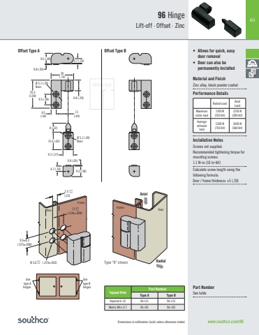 415ACTUAL SIZETapped HolePart NumberType A Type BImperial 6-32 96-111 96-112Metric M4 x 0.7 96-141 96-142Dimensions in millimeters (inch) unless otherwise stated www.southco.com/9696 HingeLift-off · Offset · Zinc• Allows for quick, easy door removal• Door can also be permanently installedMaterial and FinishZinc alloy, black powder coatedPerformance DetailsInstallation NotesScrews not supplied. Recommended tightening torque for mounting screws: 1.1 Nm (10 inlbf) Calculate screw length using the following formula: Door / frame thickness +5 (.20) 25.5(1.00) 9.8 (.39)Ø 5.1 (.20)15.6 (.62) Boss9.5 (.38)4.5(.18)Ø 5.1 (.20) Boss 0.8 (.03)9.5 (.38) 4.7 (.19)11(.44)4.7 (.19) 9.5 (.38)0.8 (.03)9.3 (.37)8 (.32)20(.79)AxialRadialFrame Door9.5±0.2(.375±.008)5.5 (.22)Frame+0.2-0.011 (.438±.008)+0.2-0.0Ø 5.6 (.219±.003) +0.1-0.0DoorUse type AhingesUse type BhingesOffset Type AType \Offset Type BPart NumberSee tableRadial Load AxialLoadMaximum static load1100 N(250 lbf)1250 N(280 lbf)Average ultimate load3300 N(750 lbf)2600 N(580 lbf)