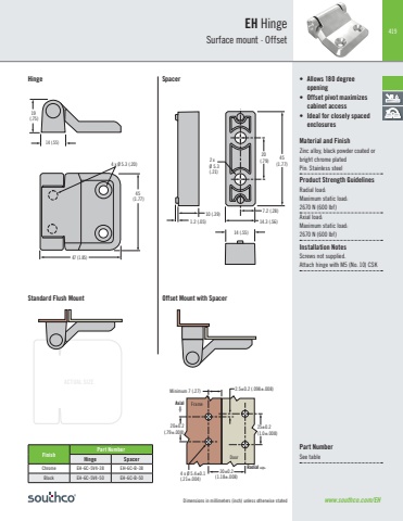 419ACTUAL SIZEFinishPart NumberHinge SpacerChrome EH-6C-5V4-38 EH-6C-B-38Black EH-6C-5V4-50 EH-6C-B-50Dimensions in millimeters (inch) unless otherwise stated www.southco.com/EHPart NumberSee tableEH HingeSurface mount · Offset • Allows 180 degree opening• Offset pivot maximizes cabinet access• Ideal for closely spaced enclosuresMaterial and FinishZinc alloy, black powder coated or bright chrome platedPin: Stainless steelProduct Strength GuidelinesRadial load:Maximum static load:2670 N (600 lbf)Axial load:Maximum static load:2670 N (600 lbf)Installation NotesScrews not supplied. Attach hinge with M5 (No. 10) CSK14 (.55) 19 (.75)4 x Ø 5.3 (.20)47 (1.85)45 (1.77)20 (.79) 45(1.77) 2 x Ø 5.3 (.21)10 (.39) 1.2 (.05)7.2 (.28)14.3 (.56)14 (.55)30±0.2(1.18±.008)2.5±0.2 (.098±.008)DoorFrame25±0.2(1.0±.008)4 x Ø 5.4±0.1(.21±.004)20±0.2(.79±.008)Minimum 7 (.27)AxialRadialStandard Flush Mount Offset Mount with SpacerHinge Spacer