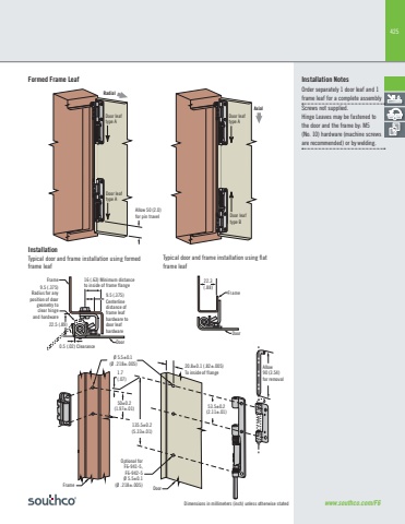 425Dimensions in millimeters (inch) unless otherwise stated www.southco.com/F6Installation Typical door and frame installation using formed frame leafTypical door and frame installation using flat frame leafAllow 50 (2.0) for pin travelDoor leaftype ADoor leaftype ADoor leaftype ADoor leaftype BAxialRadial16 (.63) Minimum distanceto inside of frame flange9.5 (.375) Centerlinedistance of frame leaf hardware todoor leafhardwareDoorFrame22.5 (.89)9.5 (.375)Radius for anyposition of doorgeometry toclear hingeand hardware0.5 (.02) ClearanceFrame Door20.8±0.1 (.82±.005)To inside of flange135.5±0.2(5.33±.01)50±0.2(1.97±.01)Ø 5.5±0.1 (Ø .218±.005)53.5±0.2(2.11±.01)1.7(.07)Allow90 (3.54) for removalOptional forF6-941-5,F6-942-5Ø 5.5±0.1(Ø .218±.005)DoorFrame22.3(.88)Formed Frame Leaf Installation NotesOrder separately 1 door leaf and 1 frame leaf for a complete assembly Screws not supplied.Hinge Leaves may be fastened to the door and the frame by: M5 (No. 10) hardware (machine screws are recommended) or by welding.