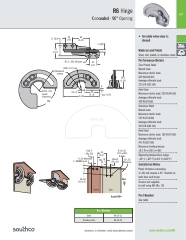 427ACTUAL SIZEwww.southco.com/R6Part NumberSteel R6-21-11Stainless steel R6-21-23Radial7 (.28) Minimum15±0.2(.59±.01) 36(1.42)18(.71)15±0.2(.59±.01) 7 (.28) Minimum21±0.2(.83±.01)Ø 5.4±0.1(.213±.004)4 Holes13 (.51)MaximumAxialFrame DoorDimensions in millimeters (inch) unless otherwise statedR6 HingeConcealed · 90° Opening• Invisible when door is closedMaterial and FinishSteel, zinc plated, or stainless steel Performance DetailsZinc Plated SteelRadial load:Maximum static load:625 N (140 lbf)Average ultimate load:2235 N (502 lbf)Axial load:Maximum static load: 205 N (46 lbf)Average ultimate load: 420 N (94 lbf)Stainless SteelRadial load:Maximum static load:525 N (118 lbf)Average ultimate load:3035 N (682 lbf)Axial load:Maximum static load: 185 N (42 lbf)Average ultimate load: 475 N (107 lbf)Maximum holding torque: 18.2 Nm (161 inlbf)Operating temperature range:-40º C (-40º F) to 85º C (185º F)Installation NotesPanel thickness exceeding 4 (.16) will require a 45˚ chamfer on both door and frame.Screws not supplied. Install using M5 (No. 10) Part NumberSee tableR18.5 (.73)InsideClearanceCenter ofrotationR18.5 (.73)76 (3) 4 (.16)38.5(1.52)5 (.20)Ø 5.2 (.20), 4 Places 15(.59)31(1.22)21 (.83) 15(.59)36(1.42)908 (.32) 30(1.18)