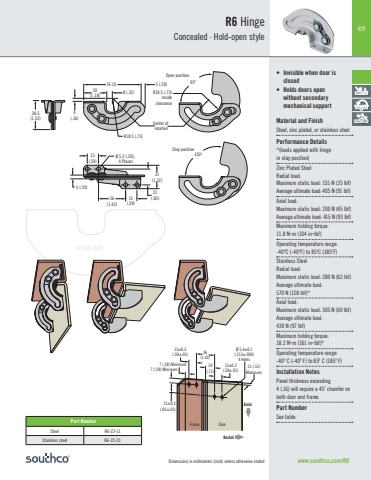 429ACTUAL SIZEwww.southco.com/R6Part NumberSteel R6-22-11Stainless steel R6-22-234(.16)76 (3)5 (.20)15(.59)Ø 5.2 (.20), 4 Places36(1.42)15(.59)21(.83)31(1.22)38.5(1.52)9501020R18.5 (.73)InsideclearanceCenter of rotationR18.5 (.73)5 (.20)8 (.32)Open positionStay position30(1.18)Radial7 (.28) Minimum15±0.2(.59±.01) 36(1.42)18(.71)15±0.2(.59±.01) 7 (.28) Minimum21±0.2(.83±.01)Ø 5.4±0.1(.213±.004)4 Holes13 (.51)MaximumAxialFrame DoorDimensions in millimeters (inch) unless otherwise statedR6 HingeConcealed · Hold-open style• Invisible when door is closed • Holds doors open without secondary mechanical supportMaterial and FinishSteel, zinc plated, or stainless steelPerformance Details*(loads applied with hinge in stay position)Zinc Plated SteelRadial load:Maximum static load: 155 N (35 lbf)Average ultimate load: 405 N (91 lbf)Axial load:Maximum static load: 200 N (45 lbf)Average ultimate load: 415 N (93 lbf)Maximum holding torque: 11.8 Nm (104 inlbf)Operating temperature range:-40ºC (-40ºF) to 85ºC (185ºF)Stainless SteelRadial load:Maximum static load: 280 N (63 lbf)Average ultimate load:570 N (128 lbf)*Axial load:Maximum static load: 305 N (69 lbf)Average ultimate load: 430 N (97 lbf)Maximum holding torque: 18.2 Nm (161 inlbf)*Operating temperature range:-40º C (-40º F) to 85º C (185º F)Installation NotesPanel thickness exceeding 4 (.16) will require a 45˚ chamfer on both door and frame.Part NumberSee table