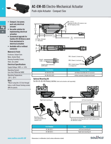 42Dimensions in millimeters (inch) unless otherwise stated• Compact, low power, push only electrical actuator• Versatile solution for implementing electrical actuation• Economical upgrade for Southco R4-05 Rotary Latch from mechanical to electrical actuation• Available with or without connectorMaterial & FinishEnclosure, Output Cam: Nylon, Acetal; BlackHousing Assembly Screws: Steel, zinc platedElectrical Specifi cationsSupply Voltage: 5VDC +/- 10%Operating Current: Less than 300mA at 5VDCOperating Temperature: -20°C - 60°CNotes*Mount using the 3.25 dia through holes or with thread forming screws (M4) for plastic.AC-EM-05 Electro-Mechanical ActuatorPush-style Actuator · Compact Size5Vwww.southco.com/AC-EM41.5(1.63) 200(7.87)24.3(.96)10(.39)12(.47)Ø7(.28)41.5(1.63) 200(7.87)24.3(.96)10(.39)12(.47)Ø7(.28)41.5(1.63) 200(7.87)24.3(.96)10(.39)12(.47) Ø7(.28)41.5(1.63) 200(7.87)24.3(.96)10(.39)12(.47)Ø7(.28)74.45(2.93)46.1(1.81)74.45(2.93)46.1(1.81)74.45(2.93)46.1(1.81)Part Number Connector TypeAC-EM-050-5010 with Molex brand Microfi t 3.0 connectorAC-EM-050-5020 without connector (stripped and tinned)Part Number TypeAC-EM-020-1 Left hand mounting kitAC-EM-020-2 Right hand mounting kit Optional Mounting KitFor R4-05-XX-505 Rotary Latches (latch and actuators sold separately)PIN 1: Ground (-) brown wireGround - 5 VDC +Control switch momentary on/off pulsePIN 1PIN 2PIN 3PIN 2: Power (+) red wirePIN 3: Control signal(+) orange wireMounting screws , Latch and Actuator not supplied in kit Kit consists of mounting plate and 2 self-tapping screwsAC-EM-020-2 shownØ8 3.25 X 2Clearance for M3 or #4 screws or use M4 self tapping screws12.6 Max. Extended7.7 RetractedRight hand mounting kit Left hand mounting kit