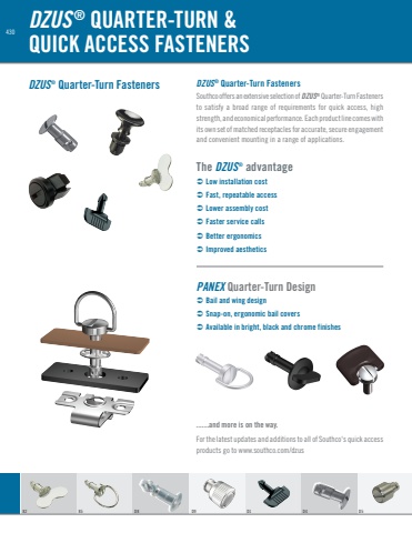 430DZUS® Quarter-Turn FastenersSouthco offers an extensive selection of DZUS® Quarter-Turn Fasteners to satisfy a broad range of requirements for quick access, high strength, and economical performance. Each product line comes with its own set of matched receptacles for accurate, secure engagement and convenient mounting in a range of applications.The DZUS® advantage Low installation cost Fast, repeatable access Lower assembly cost Faster service calls Better ergonomics Improved aestheticsDZUS® Quarter-Turn Fasteners82 85 D8 D9 D1 D4 D5DZUS ® QUARTER-TURN &QUICK ACCESS FASTENERSPANEX Quarter-Turn Design Bail and wing design Snap-on, ergonomic bail covers Available in bright, black and chrome finishes.......and more is on the way.For the latest updates and additions to all of Southco's quick access products go to www.southco.com/dzus