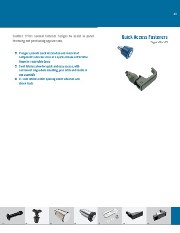 431D7 NY 56 56 TL 19 19Southco offers several fastener designs to assist in panel fastening and positioning applications Plungers provide quick installation and removal of components and can serve as a quick-release retractable hinge for removable doors  Swell latches allow for quick and easy access, with convenient single-hole mounting, plus latch and handle in one assembly TL slide latches resist opening under vibration and shock loadsQuick Access FastenersPages 500 - 509