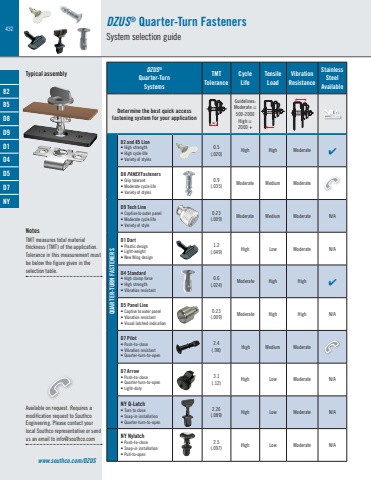 432Dimensions in millimeters (inch) unless otherwise stated8285D8D9D1D4D5D7NYDZUS®Quarter-TurnSystemsTMTToleranceCycleLifeTensileLoadVibrationResistance StainlessSteelAvailableDetermine the best quick accessfastening system for your application TMTGuidelines: Moderate = 500-2000 High = 2000 +QUARTER-TURN FASTENERS 82 and 85 Lion• High strength• High cycle life• Variety of styles0.5(.020) High High Moderate D8 PANEX Fasteners• Grip tolerant• Moderate cycle life• Variety of styles0.9(.035) Moderate Medium ModerateD9 Tech Line• Captive to outer panel• Moderate cycle life• Variety of style0.23(.009) Moderate Medium Moderate N/AD1 Dart• Plastic design• Light-weight• New Wing design1.2 (.049) High Low Moderate N/AD4 Standard• High clamp force• High strength• Vibration resistant0.6 (.024) Moderate High High D5 Panel Line• Captive to outer panel• Vibration resistant• Visual latched indication0.23(.009) Moderate High High N/AD7 Pilot• Push-to-close• Vibration resistant• Quarter-turn-to-open2.4 (.98) High Medium ModerateD7 Arrow• Push-to-close• Quarter-turn-to-open• Light-duty3.1 (.12) High Low Moderate N/ANY Q-Latch• Turn to close• Snap-in installation• Quarter-turn-to-open2.26(.089) High Low Moderate N/ANY Nylatch• Push-to-close• Snap-in installation• Pull-to-open2.5(.097) High Low Moderate N/Awww.southco.com/DZUSTypical assemblyNotesTMT measures total material thickness (TMT) of the application. Tolerance in this measurement must be below the figure given in the selection table.Available on request. Requires a modification request to Southco Engineering. Please contact your local Southco representative or send us an email to info@southco.comDZUS® Quarter-Turn FastenersSystem selection guide