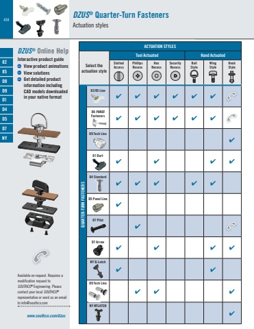 434www.southco.com/dzus Dimensions in millimeters (inch) unless otherwise statedDZUS® Online HelpInteractive product guideView product animationsView solutionsGet detailed product information including CAD models downloadedin your native formatAvailable on request. Requires amodification request to SOUTHCO® Engineering. Please contact your local SOUTHCO® representative or send us an email to info@southco.comACTUATION STYLESSelect the actuation styleTool Actuated Hand ActuatedSlottedAccessPhillipsRecessHexRecessSecurity RecessBail StyleWing StyleKnob StyleQUARTER-TURN FASTENERS82/85 Lion D8 PANEX Fasteners D9 Tech LineD1 Dart D4 Standard D5 Panel LineD7 PilotD7 Arrow NY Q-Latch D9 Tech Line NY NYLATCHDZUS® Quarter-Turn FastenersActuation styles8285D8D9D1D4D5D7NY
