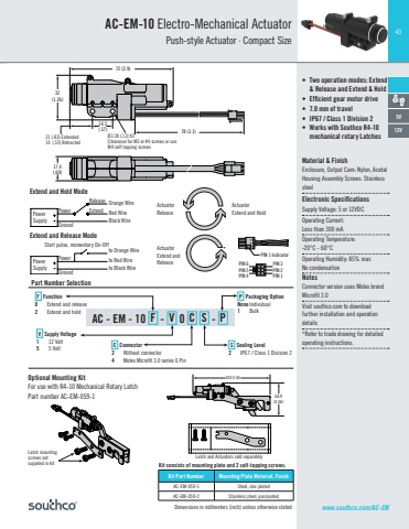 43Dimensions in millimeters (inch) unless otherwise statedAC-EM-10 Electro-Mechanical ActuatorPush-style Actuator · Compact Size• Two operation modes: Extend & Release and Extend & Hold• Efficient gear motor drive• 7.0 mm of travel• IP67 / Class 1 Division 2• Works with Southco R4-10 mechanical rotary LatchesMaterial & Finish Enclosure, Output Cam: Nylon, AcetalHousing Assembly Screws: Stainless steelElectronic SpecificationsSupply Voltage: 5 or 12VDCOperating Current: Less than 300 mAOperating Temperature: -20°C - 60°COperating Humidity: 85% maxNo condensationNotesConnector version uses Molex brand Microfit 3.0Visit southco.com to download further installation and operation details*Refer to trade drawing for detailed operating instructions.5V12Vwww.southco.com/AC-EM72 (2.9)17.4(.69)14.5(.57) 78 (3.1)32(1.26)21 (.83) Extended14 (.55) RetractedØ3.28 (.13) X2Clearance for M3 or #4 screws or use M4 self tapping screwsAC - EM - 10 F - V 0 C S - PF Function0 Extend and release2 Extend and holdV Supply Voltage1 12 Volt5 5 Volt C Connector2 Without connector4 Molex Microfit 3.0 series 6 Pin S Sealing Level2 IP67 / Class 1 Division 2P Packaging OptionNone Individual1 BulkOptional Mounting KitFor use with R4-10 Mechanical Rotary LatchPart number AC-EM-059-1152.5 (6)152.5 (6)53.9(2.12)64.9(2.56)Latch mounting screws not supplied in kitPart Number SelectionExtend and Hold ModeExtend and Release ModePowerSupplyPowerRelease Orange WireRed WireBlack WireExtendGroundPowerSupplyPowerStart pulse, momentary On-Offto Orange Wireto Red Wireto Black Wire GroundActuator Extend and ReleaseActuator ReleaseActuatorExtend and Hold11 2 3PIN 3PIN 2PIN 1PIN 1 IndicatorPIN 6PIN 5PIN 4152.5 (6)152.5 (6)53.9(2.12)64.9(2.56)Kit Part Number Mounting Plate Material, FinishAC-EM-059-1 Steel, zinc plated AC-EM-059-2 Stainless steel, passivatedKit consists of mounting plate and 2 self-tapping screws:152.5 (6)152.5 (6)53.9(2.12)64.9(2.56)Latch and Actuators sold separately