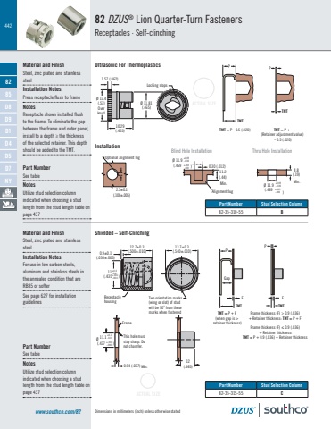 442Dimensions in millimeters (inch) unless otherwise statedACTUAL SIZEACTUAL SIZE8285D8D9D1D4D5D7NY82 DZUS® Lion Quarter-Turn FastenersReceptacles · Self-clinchingwww.southco.com/82Material and FinishSteel, zinc plated and stainless steelInstallation NotesPress receptacle flush to frameNotesReceptacle shown installed flush to the frame. To eliminate the gap between the frame and outer panel, install to a depth ≥ the thickness of the selected retainer. This depth should be added to the TMT.Ultrasonic For ThermoplasticsØ 11.81(.465)10.29(.405)Ø 13.4(.53)OverknurlLocking stops1.57 (.062)0.30 (.012)11.2(.44)2.5±0.1(.100±.005)Optional alignment lug4.8(.19)Min. Ø 11.9(.469 +.003-.000+0.09-.0.00)Min.Ø 11.9(.469 +.003-.000+0.09-.0.00)Alignment lug0.30 (.012)11.2(.44)2.5±0.1(.100±.005)Optional alignment lug4.8(.19)Min. Ø 11.9(.469 +.003-.000+0.09-.0.00)Min.Ø 11.9(.469 +.003-.000+0.09-.0.00)Alignment lugShielded – Self-ClinchingTMT = P - 0.5 (.020) TMT = P + (Retainer adjustment value) - 0.5 (.020)TMTTMTP PPart NumberSee tableNotesUtilize stud selection column indicated when choosing a stud length from the stud length table on page 437Material and FinishSteel, zinc plated and stainless steelInstallation NotesFor use in low carbon steels, aluminum and stainless steels in the annealed condition that are RB85 or softerSee page 627 for installation guidelinesFrame thickness (F) > 0.9 (.036) + Retainer thickness: TMT = P + F Frame thickness (F) ≤ 0.9 (.036) + Retainer thickness:TMT = P + 0.9 (.036) + Retainer thickness F FPPTMT TMTTMT = P + F (when gap is > retainer thickness)Gap13.7±0.3(.540±.010)12.7±0.3(.500±.010)ReceptaclehousingTwo orientation marks (wing or slot) of studwill be 900 from these marks when fastened0.9±0.1(.036±.005)(.435+0.0-0.4+.001-.004 )11This hole muststay sharp. Donot chamfer.Frame0.94 (.037) Min.+.003-.000+0.1-0.0)Ø(.43711.112(.465)Blind Hole Installation Thru Hole InstallationPart Number Stud Selection Column 82-35-310-55 BPart Number Stud Selection Column 82-35-315-55 CPart NumberSee tableNotesUtilize stud selection column indicated when choosing a stud length from the stud length table on page 437Installation