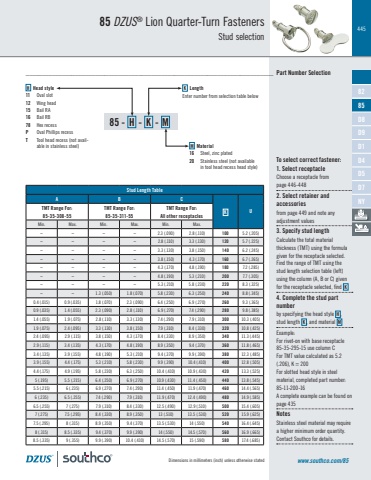 445Dimensions in millimeters (inch) unless otherwise stated85 - H - K - MH Head style11 Oval slot12 Wing head15 Bail RA16 Bail RB78 Hex recess P Oval Phillips recessT Tool head recess (not available in stainless steel) M Material16 Steel, zinc plated20 Stainless steel (not available in tool head recess head style)K LengthEnter number from selection table below85 DZUSĀ® Lion Quarter-Turn FastenersStud selectionStud Length TableA B CK U TMT Range For:85-35-308-55TMT Range For:85-35-311-55TMT Range For:All other receptaclesMin. Max. Min. Max. Min. Max.~ ~ ~ ~ 2.3 (.090) 2.8 (.110) 100 5.2 (.205)~ ~ ~ ~ 2.8 (.110) 3.3 (.130) 120 5.7 (.225)~ ~ ~ ~ 3.3 (.130) 3.8 (.150) 140 6.2 (.245)~ ~ ~ ~ 3.8 (.150) 4.3 (.170) 160 6.7 (.265)~ ~ ~ ~ 4.3 (.170) 4.8 (.190) 180 7.2 (.285)~ ~ ~ ~ 4.8 (.190) 5.3 (.210) 200 7.7 (.305)~ ~ ~ ~ 5.3 (.210) 5.8 (.230) 220 8.3 (.325)~ ~ 1.3 (.050) 1.8 (.070) 5.8 (.230) 6.3 (.250) 240 8.8 (.345)0.4 (.015) 0.9 (.035) 1.8 (.070) 2.3 (.090) 6.4 (.250) 6.9 (.270) 260 9.3 (.365)0.9 (.035) 1.4 (.055) 2.3 (.090) 2.8 (.110) 6.9 (.270) 7.4 (.290) 280 9.8 (.385)1.4 (.055) 1.9 (.075) 2.8 (.110) 3.3 (.130) 7.4 (.290) 7.9 (.310) 300 10.3 (.405)1.9 (.075) 2.4 (.095) 3.3 (.130) 3.8 (.150) 7.9 (.310) 8.4 (.330) 320 10.8 (.425)2.4 (.095) 2.9 (.115) 3.8 (.150) 4.3 (.170) 8.4 (.330) 8.9 (.350) 340 11.3 (.445)2.9 (.115) 3.4 (.135) 4.3 (.170) 4.8 (.190) 8.9 (.350) 9.4 (.370) 360 11.8 (.465)3.4 (.135) 3.9 (.155) 4.8 (.190) 5.3 (.210) 9.4 (.370) 9.9 (.390) 380 12.3 (.485)3.9 (.155) 4.4 (.175) 5.3 (.210) 5.8 (.230) 9.9 (.390) 10.4 (.410) 400 12.8 (.505)4.4 (.175) 4.9 (.195) 5.8 (.230) 6.3 (.250) 10.4 (.410) 10.9 (.430) 420 13.3 (.525)5 (.195) 5.5 (.215) 6.4 (.250) 6.9 (.270) 10.9 (.430) 11.4 (.450) 440 13.8 (.545)5.5 (.215) 6 (.235) 6.9 (.270) 7.4 (.290) 11.4 (.450) 11.9 (.470) 460 14.4 (.565)6 (.235) 6.5 (.255) 7.4 (.290) 7.9 (.310) 11.9 (.470) 12.4 (.490) 480 14.9 (.585)6.5 (.255) 7 (.275) 7.9 (.310) 8.4 (.330) 12.5 (.490) 12.9 (.510) 500 15.4 (.605)7 (.275) 7.5 (.295) 8.4 (.330) 8.9 (.350) 13 (.510) 13.5 (.530) 520 15.9 (.625)7.5 (.295) 8 (.315) 8.9 (.350) 9.4 (.370) 13.5 (.530) 14 (.550) 540 16.4 (.645)8 (.315) 8.5 (.335) 9.4 (.370) 9.9 (.390) 14 (.550) 14.5 (.570) 560 16.9 (.665)8.5 (.335) 9 (.355) 9.9 (.390) 10.4 (.410) 14.5 (.570) 15 (.590) 580 17.4 (.685)www.southco.com/85___________________________________________________________________________ Part Number SelectionTo select correct fastener:1. Select receptacleChoose a receptacle from page 446-4482. Select retainer and accessoriesfrom page 449 and note any adjustment values3. Specify stud lengthCalculate the total material thickness (TMT) using the formula given for the receptacle selected.Find the range of TMT using the stud length selection table (left) using the column (A, B or C) given for the receptacle selected, find K4. Complete the stud part numberby specifying the head style H , stud length K , and material MExample: For rivet-on with base receptacle 85-35-295-15 use column CFor TMT value calculated as 5.2 (.206), K = 200For slotted head style in steel material, completed part number: 85-11-200-16A complete example can be found on page 435NotesStainless steel material may require a higher minimum order quantity. Contact Southco for details.D1D4D5D7NY82D8D985