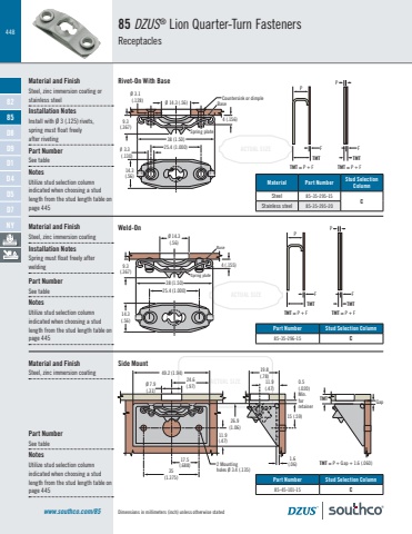 448Dimensions in millimeters (inch) unless otherwise statedACTUAL SIZEACTUAL SIZEACTUAL SIZEwww.southco.com/8585 DZUS® Lion Quarter-Turn FastenersReceptaclesMaterial and FinishSteel, zinc immersion coating or stainless steel Installation NotesInstall with Ø 3 (.125) rivets, spring must float freely after rivetingPart NumberSee tableNotesUtilize stud selection column indicated when choosing a stud length from the stud length table on page 44525.4 (1.000)38 (1.50)Ø 14.3 (.56)9.3(.367)14.3(.56)4 (.156)3.1(.128)Ø 3.3(.130)Ø BaseSpring plateCountersink or dimpleRivet-On With BaseTMT = P + FF FPPTMT TMTTMT = P + F Material and FinishSteel, zinc immersion coatingInstallation NotesSpring must float freely after weldingWeld-On 25.4 (1.000)38 (1.50)Ø 14.3(.56)9.3(.367)14.3(.56)4 (.155)BaseSpring plateTMT = P + FF FPPTMT TMTTMT = P + F Material and FinishSteel, zinc immersion coating Side Mount11.9(.47)26.9(1.06)17.5(.688) 35 (1.375)49.2 (1.94)24.6(.97) Ø 7.9(.31)0.5(.020)Min. for retainer11.9(.47)15 (.59)1.6(.06)19.8(.78)2 Mountingholes Ø 3.4 (.135)TMT GapTMT = P + Gap + 1.6 (.060)Part NumberSee tableNotesUtilize stud selection column indicated when choosing a stud length from the stud length table on page 445Part Number Stud Selection Column 85-35-296-15 CMaterial Part Number Stud Selection Column Steel 85-35-295-15CStainless steel 85-35-295-20Part Number Stud Selection Column 85-45-101-15 CPart NumberSee tableNotesUtilize stud selection column indicated when choosing a stud length from the stud length table on page 4458285D8D9D1D4D5D7NY