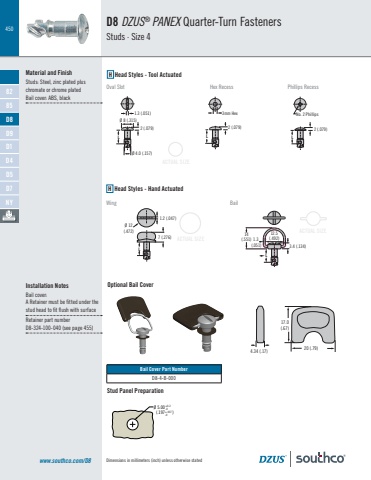 450Dimensions in millimeters (inch) unless otherwise statedACTUAL SIZEACTUAL SIZEACTUAL SIZED8 DZUS® PANEX Quarter-Turn FastenersStuds · Size 4Material and FinishStuds: Steel, zinc plated plus chromate or chrome platedBail cover: ABS, black1.3 (.051)Ø 8 (.315)Ø 4.0 (.157)2 (.079)L7 (.276)Ø 12(.472)L1.2 (.047)14(.551)12.51.3 (.492)(.051) 3.4 (.134)LØ 5.00 (.197 )+0.2-0+.007-02 (.079)No. 2 Phillips L3mm Hex2 (.079)LH Head Styles - Tool ActuatedOval Slot Hex Recess Phillips RecessH Head Styles - Hand ActuatedWing BailStud Panel Preparationwww.southco.com/D8Optional Bail Cover4.34 (.17)17.0(.67)20 (.79)Installation NotesBail cover:A Retainer must be fitted under the stud head to fit flush with surfaceRetainer part number D8-324-100-040 (see page 455)Bail Cover Part NumberD8-4-B-0008285D8D9D1D4D5D7NY