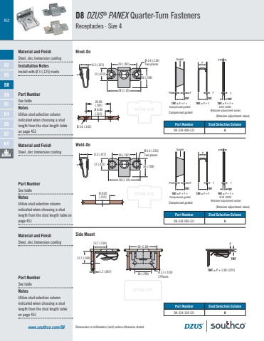 452Dimensions in millimeters (inch) unless otherwise statedACTUAL SIZEACTUAL SIZEACTUAL SIZEwww.southco.com/D8D8 DZUS® PANEX Quarter-Turn FastenersReceptacles · Size 4Material and FinishSteel, zinc immersion coatingInstallation NotesInstall with Ø 3 (.125) rivets20 (.787)12 (.472)18 (.709)28 (1.10)8.3 (.327)Ø 3.4 (.134)Two placesTMT = P + F +0.50 (.020) (Retainer adjustment value)PPPTMTTMT = P + F + Compressed gasketGasketTMT = P + F TMTFTMTF FMaterial and FinishSteel, zinc immersion coatingWeld-On 20 (.787)12 (.472) 18 (.709)28 (1.10)Ø 6.4 (.252)8.3 (.327) Two placesØ 8.00(.315)20.00(.787)Ø 3.6 (.142)Ø 8.00(.315)5.4(.21)Rivet-On Material and FinishSteel, zinc immersion coatingSide Mount TMT = P + 1.90 (.075)TMTP30 (1.18)Ø 3.3 (.130)2 Places 18 (.709)13.7 (.539)12.7 (.500)1.2 (.047)Part NumberSee tableNotesUtilize stud selection column indicated when choosing a stud length from the stud length tableon page 451TMT = P + F +0.50 (.020) (Retainer adjustment value)PPPTMTTMT = P + F + Compressed gasketGasketTMT = P + F TMTFTMTF FPart Number Stud Selection Column D8-334-400-121 APart Number Stud Selection Column D8-334-500-121 APart Number Stud Selection Column D8-334-310-121 BPart NumberSee tableNotesUtilize stud selection column indicated when choosing a stud length from the stud length tableon page 451Part NumberSee tableNotesUtilize stud selection column indicated when choosing a stud length from the stud length table on page 4518285D8D9D1D4D5D7NYCompressed gasketCompressed gasket(Retainer adjustment value)(Retainer adjustment value)