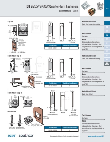 453Dimensions in millimeters (inch) unless otherwise statedACTUALSIZE9.50+0.1(.375±.004)Frame thickness0.7 - 2.5 (.028 - .099)ACTUALSIZEwww.southco.com/D8D8 DZUS® PANEX Quarter-Turn FastenersReceptacles · Size 4Material and FinishSteel, zinc immersion coatingMaterial and FinishSteel, zinc immersion coatingClip-On 22 (.472)8 (.315) 10 (.394)22.5(.886)TMT = P + F + 0.70 (.028)PPPTMT TMTTMT = P + F + Compressed gasketGasketTMT = P TMT 12.00 (.472) Min.10.00 (.394) Max.Frame thickness0.70 (.027) to 2.50 (.098)Ø 8.00 (.315) + 0.2 (.008) Min.Material and FinishSteel, zinc platedTMT = P + 1.0 (.039) (Includes retainer)PPPTMT TMTTMT = P + Compressed gasketGasketTMT = P TMTFront Mount Snap-In 12.8(.50)9.3(.366) 11.5(.453)0.5 (.020)ACTUAL SIZEPart NumberSee tableNotesUtilize stud selection column indicated when choosing a stud length from the stud length table on page 451Press & turn Installed positionInstallationPart Number Stud Selection Column D8-334-300-121 BPart Number Stud Selection Column D8-334-200-190 CPart NumberSee tableNotesUtilize stud selection column indicated when choosing a stud length from the stud length table on page 451Part NumberSee tableNotesUtilize stud selection column indicated when choosing a stud length from the stud length table on page 451D1D4D5D7NY82D8D985TMT = P + F + 0.70 (.028)PPPTMT TMTTMT = P + F + Compressed gasketGasketTMT = P TMTFront Mount Clip-In Part Number Stud Selection Column D8-334-700-121 B13+0.2/-0.0(.51±.008/-.000)1.75(0.69) - 2.5(.099)17.5+0.2/-0.0(.69±.008/-000)R 1(.04) MAX2.9 (.11)26.3(1.03)11.6(.46)2.5(.1)12.6 (.5)17(.67)Frame thicknessPress & turn Installed positionGasket