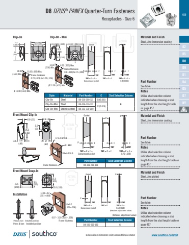 459Dimensions in millimeters (inch) unless otherwise statedACTUALSIZEACTUALSIZEACTUALSIZEACTUALSIZEwww.southco.com/D8D8 DZUS® PANEX Quarter-Turn FastenersReceptacles · Size 6D1D4D5D7NY82D8D985Material and FinishSteel, zinc immersion coatingClip-On Front Mount Clip-In TMT = P + F + 0.8 (0.031)F F FPPPTMT TMTTMT = P + F + Compressed gasketGasketTMT = P + F TMT14.00(.551) Min.11.00 (.433) Max.Frame thickness0.70 (.028) to 3.20 (.126)Ø 11.00 (.433) Min.Material and FinishSteel, zinc immersion coating13.10(.516) Min. 8.00 (.315) Max.Frame thickness0.9 (.035) to 2.5 (.098)Ø 11.00 (.433) Min.TMT = P + F + 0.70 (.028)F F FPPPTMT TMTTMT = P + F + Compressed gasketGasketTMT = P + F TMTClip-On - MiniFront Mount Snap-In 16.5(.650)13.6 (.535)16.5(.650)0.5(.020)Material and FinishSteel, zinc platedPart NumberSee tableNotesUtilize stud selection column indicated when choosing a stud length from the stud length table on page 457TMT = P + 0.50 (.020) (Retainer adjustment value)PPPTMT TMTTMT = P + Compressed gasketGasketTMT = P TMTPress & turn Installed position14.00+0.2 (.551+.008)0.07 - 3.20 (.028 - .126)Frame thickness14+0.2 (.551+.008)Style Material Part Number C Stud Selection Column Clip-On Steel D8-336-300-121 0.8(0.031)Clip-On-Mini Steel D8-336-330-121 B0.7(0.028)Clip-On-Mini Stainless steel D8-336-330-200Part Number Stud Selection Column D8-336-700-121 BPart Number Stud Selection Column D8-336-200-190 CPart NumberSee tableNotesUtilize stud selection column indicated when choosing a stud length from the stud length table on page 457Part NumberSee tableNotesUtilize stud selection column indicated when choosing a stud length from the stud length table on page 457Installation25 (.984)15.8 (.622)9.3(.366)25(.984)8.6 (.339) 24 (.945)12.3(.484)8.8 (.346)Press & turn Installed position13+0.2/-0.017.5+0.2/-0.0R 1 MAX2.9 (.11)26.3(1.03)11.6(.46)2.5(.1)12.6 (.5)17(.67)Frame thickness(Retainer adjustment value)