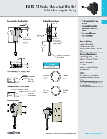 45Dimensions in millimeters (inch) unless otherwise statedEM-05-4X Electro-Mechanical Slide Bolt Push-to-close · Integrated Sensing• Push to close/electrical release• Integrated Sensors to monitor door and latch status• Retract and Release • Retract and HoldMaterial & Finish Enclosure: Nylon, blackLatch Bolt: Acetal, blackHousing Assembly Screws: Steel, zinc platedElectronic SpecificationsSupply Voltage: 5VDC +/- 10%Operating Current: < 300 mAOperating Temperature: 0°C - 60°COperating Humidity: 85% maxNo condensationNotesVisit Southco.com to download further installation and operation details.Add -1 to the end of the part number for bulk packaging.www.southco.com/EM-106.6(.26)46 (1.8)14 (.55)5.5 (.22)28 (1.1)7.5 (.30)2X Ø4.2(.17)8 (.31)16.5(.65)37(1.46)2X Ø2.4(.1)135(5.31)61(2.4)8 (.31)6.6(.26)46 (1.8)14 (.55)5.5 (.22)28 (1.1)7.5 (.30)2X Ø4.2(.17)8 (.31)16.5(.65)37(1.46)2X Ø2.4(.1)135(5.31)61(2.4)8 (.31)6.6(.26)46 (1.8)14 (.55)5.5 (.22)28 (1.1)7.5 (.30)2X Ø4.2(.17)8 (.31)16.5(.65)37(1.46)2X Ø2.4(.1)135(5.31)61(2.4)8 (.31)Part NumberEM-05-42-2401Perpendicular Mounting Holes In-Line Mounting HolesTwo Position (Lock-Unlock) ModeStart Pulse (Auto-Relock) ModeMounting OptionsPowerSupplyPowerRetract Orange WireRed WireBrown WireExtendGroundPowerSupplyPowerStart pulse, momentary On-Offto Orange Wireto Red Wireto Brown Wire GroundMounting Holes Mounting holes for thread forming screws (size M4)Latch boltretractLatch boltretractLatch boltextendLatch boltextendMolex brand 6 pin Microfit 3.0 connectorIntegrated reed switchMin.