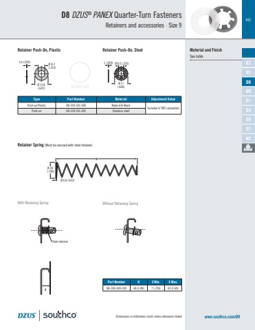 467Dimensions in millimeters (inch) unless otherwise stated www.southco.com/D8D8 DZUS® PANEX Quarter-Turn FastenersRetainers and accessories · Size 9Material and FinishSee table1.0 (.039) Ø 8.2(.323)Ø 15.8(.622)1 (.039) Ø 8.5 (.335)Ø 17(.669)Ø 18 (.709)Ø 0.8 (.031)HSteel retainer XWith Retaining Spring Without Retaining SpringPart Number H X Min. X Max.D8-329-200-200 48 (1.89) 7 (.276) 43 (1.69)Type Part Number Material Adjustment ValuePush-on Plastic D8-329-101-040 Nylon 6/6 BlackIncluded in TMT calculationPush-on D8-329-101-200 Stainless steelRetainer Push-On, Plastic Retainer Push-On, SteelRetainer Spring (Must be secured with steel retainer)ACTUAL SIZED1D4D5D7NY82D8D985