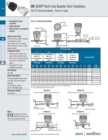 468Dimensions in millimeters (inch) unless otherwise statedD9 DZUS® Tech Line Quarter-Turn FastenersD9-47 Stud Assemblies · Press-in stylewww.southco.com/D9• Designed for hand operation• Spring ejected• Wide variety of receptacle optionsMaterial and FinishStud and ferrule: Steel, hardened, zinc plated plus sealerSpring: Music wire, zinc platedKnob: Aluminum, natural or black powder coatedInstallation Notes1. Prepare panel as shown. Top edge of hole should be sharp. 2. Press stud assembly into panel until ferrule is installed as shown.3. See page 627 for more installation guidelines.Part NumberSee tableBlack Knob OptionFor black powdered coated knob, add \Example:D9-47-1301-K, naturalD9-47-1301-K000, blackReceptacle DetailsSee page 471NotesTo ensure you receive SOUTHCO® quality parts, look for the segmented circle.Stud Length TableA B C DStud AssembliesFlat receptacle D9-61-11mounted below panelFlat receptacle D9-61-11mounted above panelSaddle receptacle D9-62-11Press-in receptacle D9-63-11TMT Range TMT Range TMT Range TMT RangeMin Nominal Max Min Nominal Max Min Nominal Max Min Nominal Max P-1 P-2 Stud LengthPart Number2.1 (.08)2.8(.11)3.0(.12)2.9(.11)3.6(.14)3.8(.15)5.3(.21)6.0(.24)6.2(.24)1.4(.06)2.1(.08)2.3(.09)4.6(.18)8.3(.33) 1 D9-47-1301-K3.1(.12)3.8(.15)4.0(.16)3.9(.15)4.6(.18)4.8(.19)6.3(.25)7.0(.28)7.2(.28)2.4(.09)3.1(.12)3.3(.13)5.6(.22)9.3(.37) 2 D9-47-1302-K4.1(.16)4.8(.19)5.0(.20)4.9(.19)5.6(.22)5.8(.23)7.3(.29)8.0(.31)8.2(.32)3.4(.13)4.1(.16)4.3(.17)6.6(.26)10.3(.41) 3 D9-47-1303-K5.1(.20)5.8(.23)6.0(.24)5.9(.23)6.6(.26)6.8(.27)8.3(.33)9.0(.35)9.2(.36)4.4(.17)5.1(.20)5.3(.21)7.6(.30)11.3(.44) 4 D9-47-1304-KPress-in Style Stud AssemblyØ6.3 (.25)Ø11.7(.46)A Min = 0.9 (.035)A Max = See TableØ6.4 +0.03-0.05+.001 (.252 -.002 ) 14.6 (.57)0.8 (.03) 10.9 (.43)P-1P-2TMTQTMTQQQ 1.5 (.06)0.8 (.03) 0.8 (.03) TMTTMTColumn AWith flat receptacle D9-61-11 mounted below panelWith saddle receptacle D9-62-11Receptacle Receptacle thickness Receptacle thicknessInstalled receptacle height3.15 (.124)ReceptacleReceptacleReceptacleWith flat receptacle D9-61-11 mounted above panelWith press-in receptacle D9-63-11Column BColumn C Column DØ6.3 (.25)Ø11.7(.46)A Min = 0.9 (.035)A Max = See TableØ6.4 +0.03-0.05+.001 (.252 -.002 )No recessUnfastenedReceptacle Types (Stud Assembly shown fastened for P-2 = 8.75 (.34) all views)Q = 0.9 (.035) MIN Frame (all receptacle views)Total floatFastened8285D8D9D1D4D5D7NY
